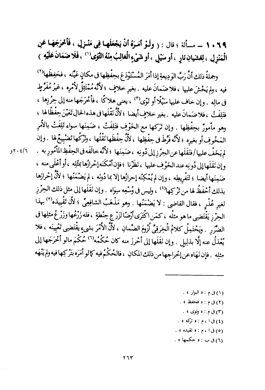 وجملةُ ذلك أَنَّ رَبَّ الوَدِيعةِ إذا أمَرَ المُسْتَوْدَعَ بحِفْظِها فى مكانٍ عَيَّنَه، فحَفِظَها (٢) فيه، ولم يَخْشَ عليها، فلا ضَمانَ عليه. بغيرِ خلافٍ؛ لأنَّه مُمْتَثِلٌ لأمْرِه، غيرُ مُفَرِّطٍ فى مالِه. وإن خاف عليها سَيْلًا أو تَوًى (٣)، يعنى هلاكًا، فأخْرَجَها منه إلى حِرْزِها، فتَلِفَتْ، فلا ضَمانَ عليه. بغير خلافٍ أيضًا؛ لأنَّ نَقْلَها فى هذه الحالِ تَعَيَّنَ حِفْظًا لها، وهو مأمورٌ بحِفْظِها. وإن تَرَكها مع الخَوْفِ فتَلِفَتْ، ضَمِنَها سواء تَلِفَتْ بالأمرِ المَخُوفِ أو بغيرِه؛ لأنَّه فَرَّطَ فى حِفْظِها؛ لأنَّ حِفْظَها نَقْلُها، وَتَرْكُها تَضْيِيعٌ لها. وإن لم يَخَفْ عليها فنَقَلَها عن الحِرْزِ إلى دُونِه، ضَمِنَها؛ لأنَّه خالَفَه فى الحِفْظِ المأْمُورِ به. وإن نَقَلَها إلى دُونِه عند الخَوْفِ عليها، نَظَرْنا؛ فإن أمْكَنَه إحْرازُها بمثْلِه، أو أعْلَى منه، ضَمِنَها أيضًا؛ لتَفْرِيطِه، وإن لم يُمْكِنْه إحرازُها إلَّا بما دُونَه، لم يَضْمَنْها؛ لأنَّ إحْرازَها بذلك أحْفَظُ لها من تَرْكِها (٤)، وليس فى وُسْعِه سِوَاه. وإن نَقَلَها إلى مثل ذلك الحِرْزِ لغيرِ عُذْرٍ، فقال القاضى: لا يَضْمَنُها. وهو مَذْهَبُ الشافِعِىِّ؛ لأنَّ تَقْيِيدَه (٥) بهذا الحِرْزِ يَقْتَضِى ما هو مثلُه، كمَن اكْتَرَى أَرْضًا لزَرْعِ حنْطةٍ، فله زَرْعُها وزَرْعُ مثلِها فى الضَّرَرِ. ويَحْتَمِلُ كلامُ الْخِرَقِىِّ لُزُومَ الضَّمَانِ؛ لأنَّ الأمْرَ بشىءٍ يقتَضِى تَعْيِينَه، فلا يُعْدَلُ عنه إلَّا بدَلِيلٍ. وإن نَقَلَها إلى أحْرزَ منه كان حُكْمُه (٦) حُكْمَ ما لو أخْرَجَها إلى مثلِه. فإن نَهَاه عن إخْراجِها من ذلك المكانِ، فالحُكْمُ فيه كما لو أَمَرَه بتَرْكِها فيه ولم يَنْهَه