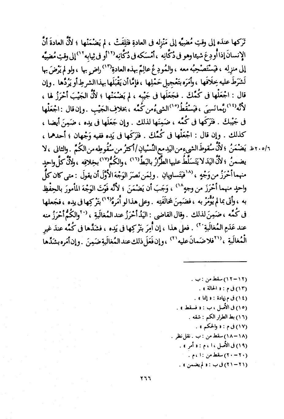 تَرَكها عندَه إلى وقتِ مُضِيِّهِ إلى مَنْزِله فى العادةِ فتَلِفَتْ، لم يَضْمَنْها؛ لأنَّ العادةَ أَنَّ الإِنسانَ إذا أُودِعَ شيئًا وهو فى دُكانِه، أَمْسَكه فى دُكَّانِه [أو فى ثِيابِه] (١٢) إلى وقتِ مُضِيِّه إلى منزِلِه، فَيْسْتَصْحِبُه معه، والمُودِعُ عالِمٌ بهذه العادةِ (١٣) راضٍ بها، ولو لم يَرْضَ بها لَشَرَطَ عليه خِلَافَها، واصمرَه بتَعْجِيلِ حَمْلِها، فإما أن يَقْبَلَها بهذا الشرطِ أو يَرُدَّها. وإن قال: اجْعَلْها فى كُمِّكَ. فجَعَلَها فى جَيْبِه، لم يَضْمَنْها؛ لأنَّ الجَيْبَ أحْرَزُ لها، لأنَّه (١٤) ربَّما نَسِىَ، فيَسْقُطُ (١٥) الشىءُ من كُمِّه، بخلافِ الجَيْبِ. وإن قال: اجْعَلْها فى جَيْبكَ. فَتَركَها فى كُمِّه، ضَمِنَها لذلك. وإن جَعَلَها فى يَدِه، ضَمِنَ أيضًا، كذلك. وإن قال: اجْعَلْها فى كُمِّكَ. فتَرَكَها فى يَدِه ففيه وَجْهان؛ أحدهما، يَضْمَنُ؛ لأنَّ سُقوطَ الشىءِ من اليَد مع النِّسْيانِ أكْثَرُ من سُقُوطِه من الكُمِّ. والثانى، لا يضمنُ؛ لأنَّ اليَدَ لا يَتَسَلَّطُ عليها الطَّرَّارُ بالبَطِّ (١٦)، والكُمُّ (١٧) بخِلافِه، ولأنَّ كلَّ واحدٍ فهما أحْرَزُ من وَجْهٍ، [فيَتَساويانِ. ولِمَن نَصَرَ الوَجْهَ الأوَّلَ أن يقولَ: متى كان كلُّ واحدٍ منهما أحْرَزَ من وجهٍ] (١٨)، وَجَبَ أن يَضْمَنَ؛ لأنَّه فَوَّتَ الوَجْهَ المأْمورَ بالحِفْظِ به، وأتى بما لم يُؤْمَرْ به، فضَمِنَ لمُخَالَفَتِه. وعلى هذا لو أَمَرهُ (١٩) بتَرْكِها فى يَدِه، فجَعلها فى كُمِّه، ضَمِنَ لذلك. وقال القاضى: اليَدُ أحْرَزُ عند المُغالَبةِ، [والكُمُّ أحْرَزُ منه عند عَدَمِ المُغالَبةِ] (٢٠). فعلى هذا، إن أُمِرَ بتَرْكِها فى يَدِه، فشَدَّها فى كُمِّه عندَ غيرِ الْمُغالَبةِ، [فلا ضَمانَ عليه] (٢١)، وإن فَعَلَ ذلك عند المُغالَبةِ ضَمِنَ. وإن أَمَره بشَدِّها