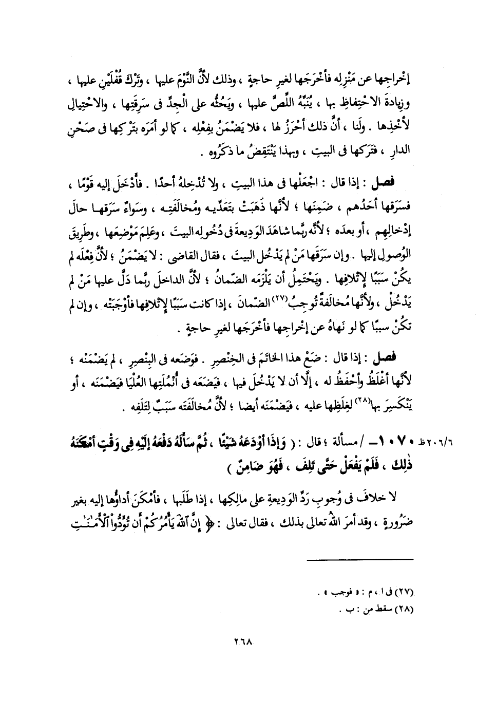 فصل: إذا قال: اجْعَلْها فى هذا البيتِ، ولا تُدْخِلهُ أحدًا. فأدْخَلَ إليه قَوْمًا، فسَرَقها أحَدُهم، ضَمِنَها؛ لأنَّها ذَهَبَتْ بتَعَدِّيه ومُخالَفَتِه، وسَواءٌ سَرَقها حالَ إدْخالِهِم، أو بعدَه؛ لأنَّه ربَّما شاهَدَ الوَدِيعةَ فى دُخُولِه البيتَ، وعَلِمَ مَوْضِعَها، وطَرِيقَ الوصُولِ إليها. وإن سَرَقَها مَنْ لم يَدْخُل البيتَ، فقال القاضى: لا يَضْمَنُ؛ لأنَّ فِعْلَه لم يكُنْ سَبَبًا لإتْلافِها. ويَحْتَمِلُ أن يَلْزَمَه الضَّمَانُ؛ لأنَّ الداخلَ ربَّمَا دَلَّ عليها مَنْ لم يَدْخُلْ، ولأنَّها مُخالَفةٌ تُوجِبُ (٢٧) الضّمانَ، إذا كانت سَبَبًا لإتْلافِها فأوْجَبَتْه، وإن لم تكُنْ سببًا كما لو نَهاهُ عن إخْراجِها فأخْرَجَها لغيرِ حاجةٍ.