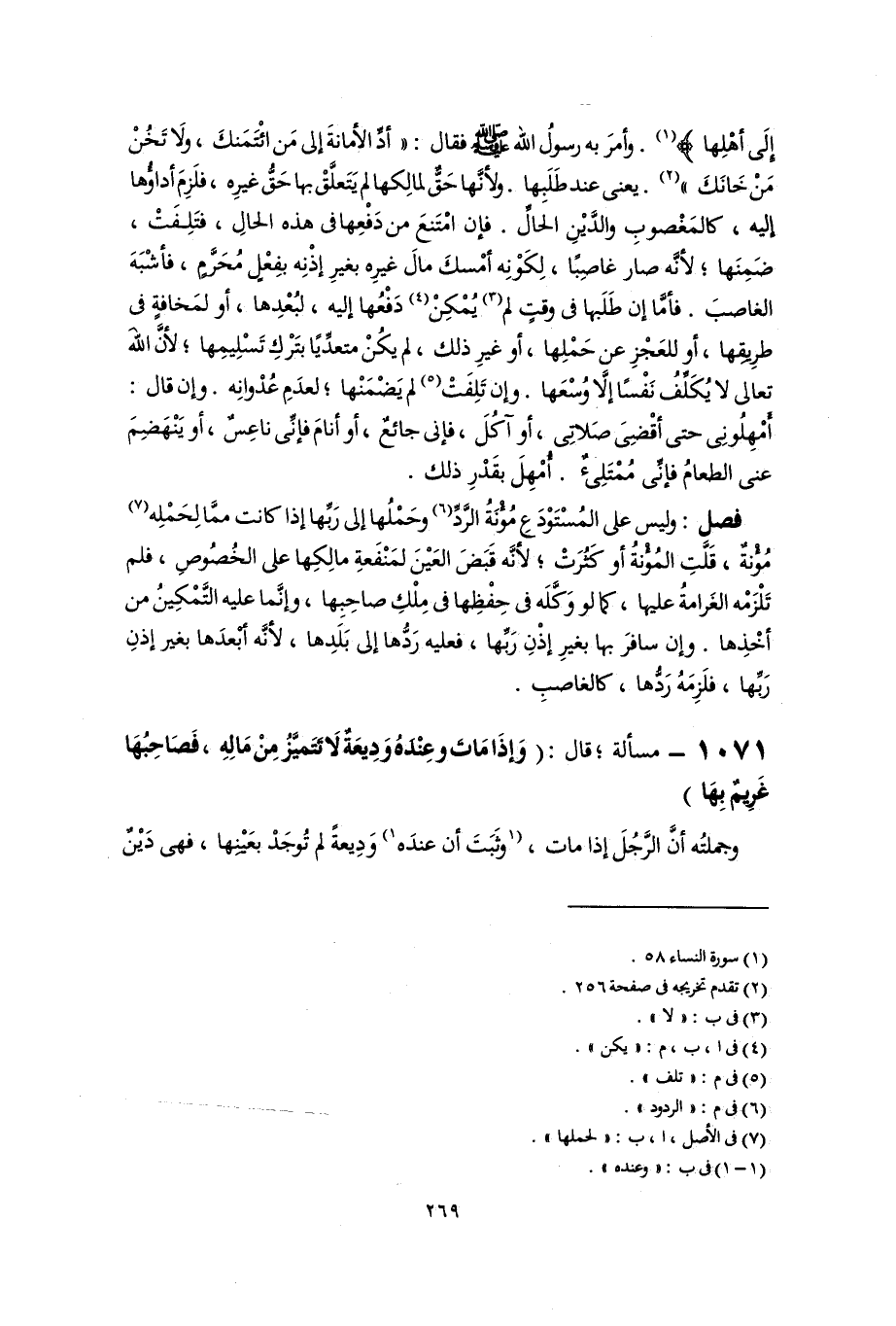 فصل: وليس على المُسْتَوْدَعِ مُؤْنَةُ الرَّدِّ (٦) وحَمْلُها إلى رَبِّها إذا كانت ممَّا لِحَمْلِه (٧) مُؤْنَةٌ، قَلَّتِ المُؤْنةُ أو كَثَرُتْ؛ لأنَّه قَبَضَ العَيْنَ لمَنْفَعةِ مالِكِها على الخُصُوصِ، فلم تَلْزَمْه الغَرامةُ عليها، كما لو وَكَّلَه فى حِفْظِها فى مِلْكِ صاحِبِها، وإنَّما عليه التَّمْكِينُ من أخْذِها. وإن سافرَ بها بغيرِ إذْنِ رَبِّها، فعليه رَدُّها إلى بَلَدِها؛ لأنَّه أَبْعدَها بغير إذنِ رَبِّها، فلَزِمَهُ رَدُّها، كالغاصبِ.