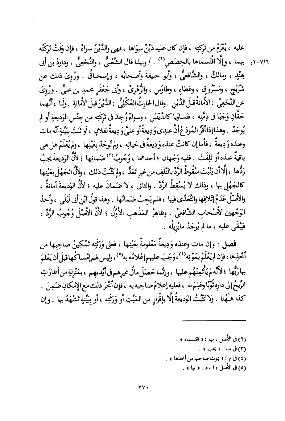 فصل: وإن مات وعندَه وَدِيعةٌ مَعْلومةٌ بعَيْنِها، فعلى وَرَثَتِه تَمْكِينُ صاحِبِها من أخْذِها، فإنَّ لم يَعْلَمْ بمَوْتِه (٤)، وَجَبَ عليهم إعْلامُه به (٥)، وليس لهم إمْساكُها قبلَ أن يَعْلَمَ بها رَبُّها؛ لأنَّه لم يَأْتَمِنْهُم عليها، وإنَّما حَصَلَ مالُ غيرِهم فى أَيْدِيهِم، بمَنْزِلةِ من أطارَتِ الرِّيحُ إلى دارِه ثَوْبًا وعَلِمَ به، فعليه إعلامُ صاحِبه به، فإن أخَّرَ ذلك مع الإمكانِ ضَمِنَ. كذا ههُنا. ولا تَثْبُتُ الوَديعةُ إلَّا بإقْرارٍ من المَيِّتِ أو وَرَثَتِه، أو بِبَيِّنةٍ تَشْهَدُ بها. وإن