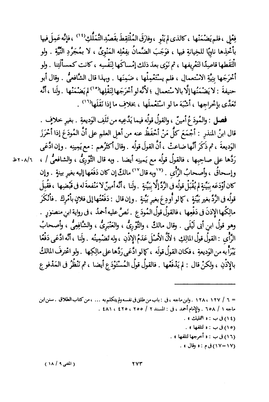 فِعْلٍ، فلم يَضْمَنْها، كالذى لم يَنْوِ، وفارَقَ المُلْتَقِطَ بقَصْدِ التَّمَلُّكِ (١٤)، فإنَّه عَمِلَ فيها بأخْذِها ناوِيًا للخِيانةِ فيها، فوَجَبَ الضَّمانُ بفِعْلِه المَنْوِىِّ، لا بمُجَرَّدِ النِّيَّةِ. ولو الْتَقَطها قاصِدًا لتَعْرِيفها، ثمَّ نَوَى بعدَ ذلك إمْساكَها لِنَفْسِه، كانت كمسأَلَتِنا. ولو أخْرَجَها بِنِيَّةِ الاسْتعمالِ، فلم يسْتَعْمِلْها، ضَمِنَها. وبهذا قال الشَّافعىُّ. وقال أبو حنيفةَ: لا يَضْمَنُها إلَّا بالاسْتعمالِ؛ لأنَّه لو أخْرَجَها لِنَقْلِها (١٥) لم يَضْمَنْها. ولَنا، أنَّه تَعَدَّى بإخْراجِها، أشْبَهَ ما لو اسْتَعْملَها، بخلافِ ما إذا نَقَلَها (١٦).