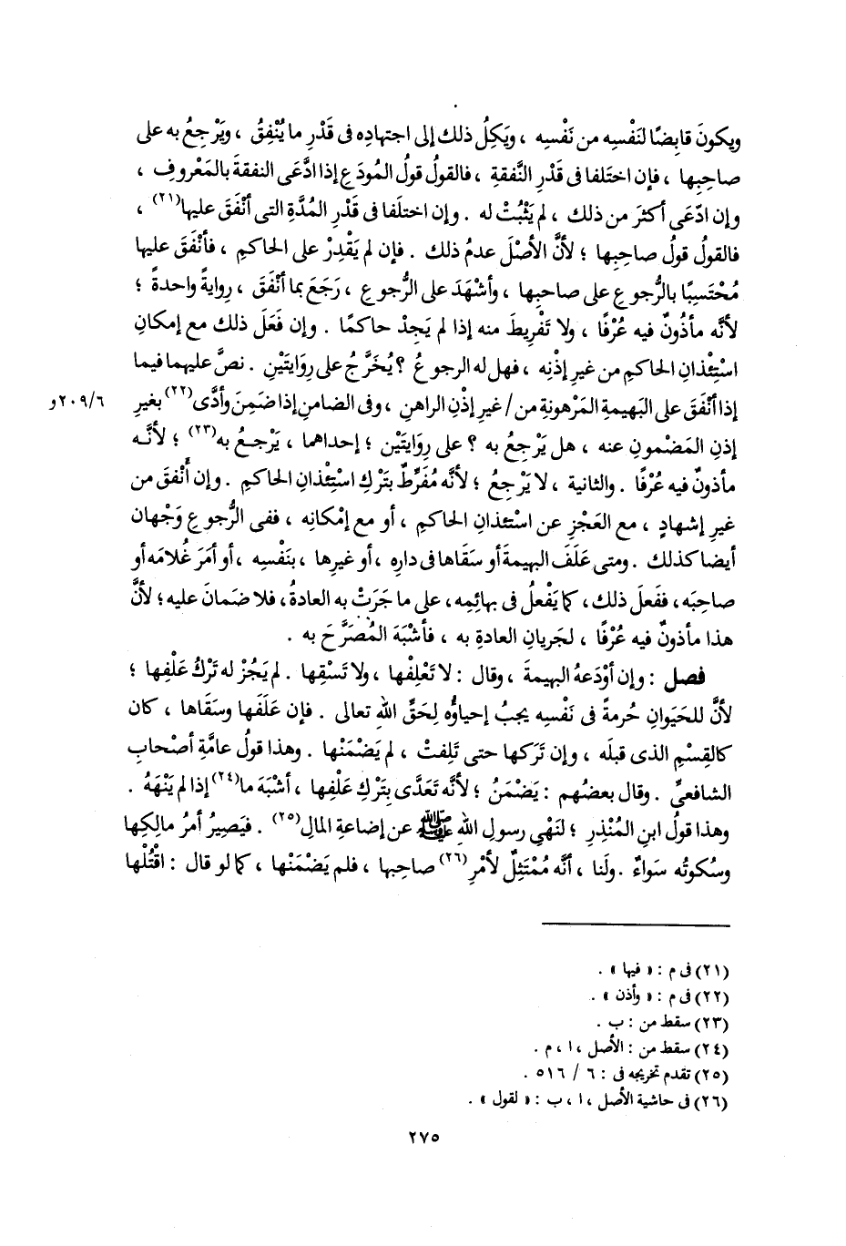 ويكونَ قابِضًا لنَفْسِه من نَفْسِه، ويَكِلُ ذلك إلى اجتهادِه فى قَدْرِ ما يُنْفِقُ، ويَرْجِعُ به على صاحِبِها، فإنَّ اختَلفا فى قَدْرِ النَّفقةِ، فالقولُ قولُ المُودَعِ إذا ادَّعَى النفقةَ بالمَعْروفِ، وإن ادَّعَى أَكْثَر من ذلك، لم يَثْبُتْ له. وإن اختلَفا فى قَدْرِ المُدَّةِ التى أَنْفَقَ عليها (٢١)، فالقولُ قولُ صاحِبِها؛ لأنَّ الأصْلَ عدمُ ذلك. فإن لم يَقْدِرْ على الحاكمِ، فأنْفَقَ عليها مُحْتَسِبًا بالرُّجوعِ على صاحبِها، وأشْهَدَ على الرُّجوعِ، رَجَعَ بما أَنْفَقَ، رِوايةً واحدةً؛ لأنَّه مأذُونٌ فيه عُرْفًا، ولا تَفْرِيطَ منه إذا لم يَجِدْ حاكمًا. وإن فَعَلَ ذلك مع إمكانِ اسْتِئْذانِ الحاكمِ من غيرِ إذْنِه، فهل له الرجوعُ؟ يُخَرَّجُ على رِوَايتَيْنِ. نصَّ عليهما فيما إذا أَنْفَقَ على البَهيمةِ المَرْهونةِ من غيرِ إذْنِ الراهنِ، وفى الضامنِ إذا ضَمِنَ وأدَّى (٢٢) بغيرِ إذنِ المَضْمونِ عنه، هل يَرْجِعُ به؟ على رِوَايتَيْن؛ إحداهما، يَرْجعُ به (٢٣)؛ لأنَّه مأذونٌ فيه عُرْفًا. والثانية، لا يَرْجِعُ؛ لأنَّه مُفَرِّطٌ بتَرْكِ اسْتِئْذانِ الحاكمِ. وإن أَنْفقَ من غيرِ إشهادٍ، مع العَجْزِ عن اسْتئذانِ الحاكمِ، أو مع إمْكانِه، ففى الرُّجوعِ وَجْهان أيضًا كذلك. ومتى عَلَفَ البهيمةَ أو سَقَاها فى دارِه، أو غيرِها، بنَفْسِه، أو أَمَرَ غُلامَه أو صاحِبَه، ففَعلَ ذلك، كما يَفْعلُ فى بهائِمِه، على ما جَرَتْ به العادةُ، فلا ضَمانَ عليه؛ لأنَّ هذا مأذونٌ فيه عُرْفًا، لجَريانِ العادةِ به، فأشْبَهَ المُصَرَّحَ به.