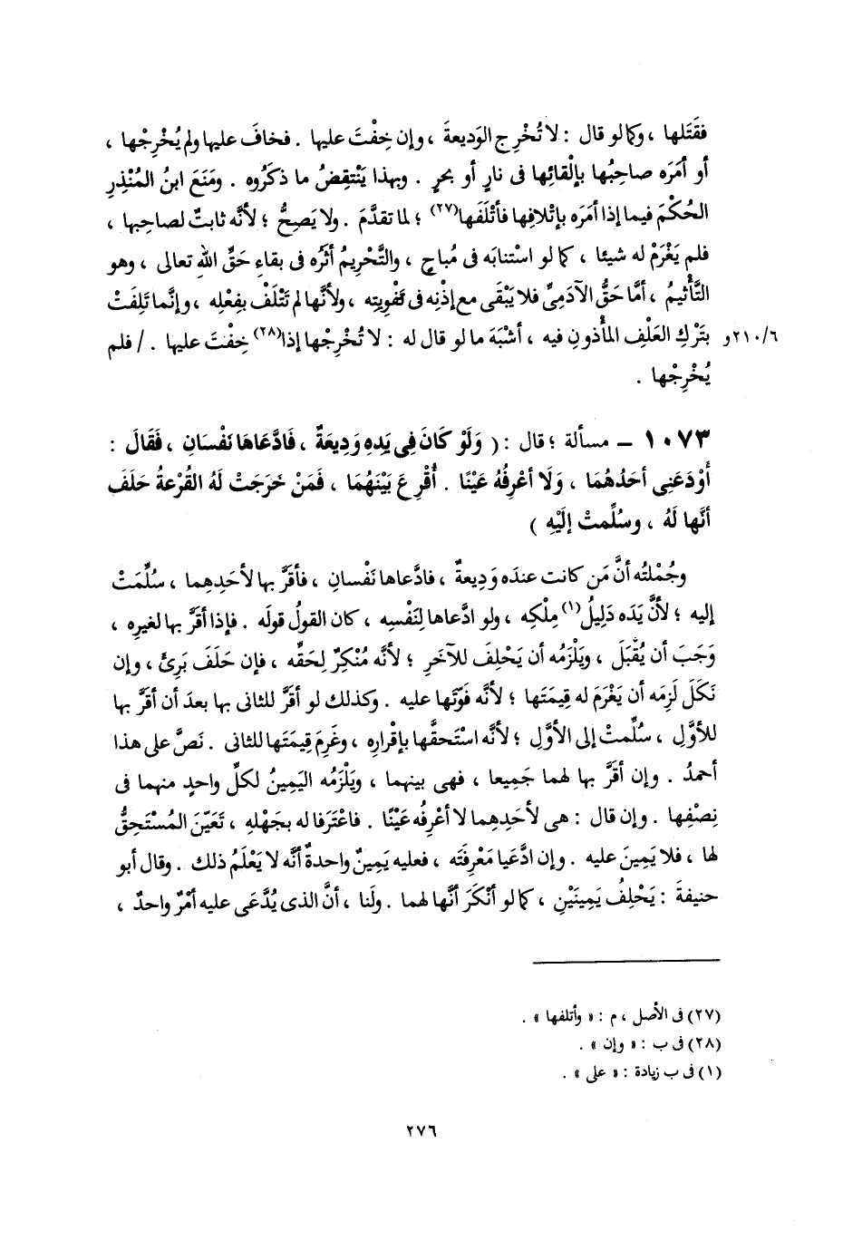 فقَتَلها، وكما لو قال: لا تُخْرِج الوَديعةَ، وإن خِفْتَ عليها. فخافَ عليها ولم يُخْرِجْها، أو أمَرَه صاحِبُها بإلْقائِها فى نارٍ أو بحرٍ. وبهذا يَنْتقِضُ ما ذكَرُوه. ومَنَعَ ابنُ المُنْذِرِ الحُكْمَ فيما إذا أمَرَه بإتْلافِها فأتْلَفَها (٢٧)؛ لما تقدَّمَ. ولا يَصِحُّ؛ لأنَّه ثابتٌ لصاحِبها، فلم يَغْرَمْ له شيئًا، كما لو اسْتنابَه فى مُباحٍ، والتَّحْرِيمُ أثَرُه فى بقاءِ حَقِّ اللَّهِ تعالى، وهو التَّأْثِيمُ، أمَّا حَقُّ الآدَمِىِّ فلا يَبْقَى مع إذْنِه فى تَفْوِيتِه، ولأنَّها لم تَتْلَفْ بفِعْلِه، وإنَّما تَلِفَتْ بتَرْكِ العَلْفِ المأْذُونِ فيه، أشْبَهَ ما لو قال له: لا تُخْرِجْها إذا (٢٨) خِفْتَ عليها. فلم يُخْرِجْها.