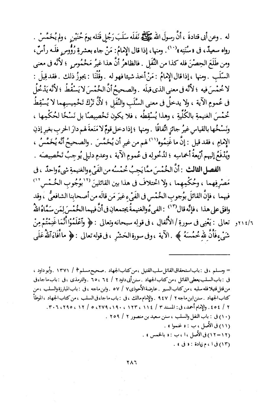 الفصل الثالث: أنَّ الخُمْسَ ممَّا يَجِبُ خُمْسُه من الفَىْءِ والغنيمةِ شىءٌ واحدٌ، فى مَصْرِفِهما، وحُكْمِهِما، ولا اخْتلافَ فى هذا بين القائلينَ [بوُجُوبِ الخُمْسِ] (١٢) فيهما، فإنَّ القائلَ بوُجوبِ الخُمْس فى الفَىْءِ غيرَ مَن قالَه من أصحابِنا الشافعىُّ، وقد وافقَ على هذا، فإنَّه قال (١٣): الفىءُ والغنيمةُ يجتمعانِ فى أَنَّ فيهما الخُمْسَ لِمَن سَمَّاهُ اللَّهُ تعالى: يَعْنِى فى سورةِ الأنْفالِ، فى قولِه سبحانه وتعالى: {وَاعْلَمُوا أَنَّمَا غَنِمْتُمْ مِنْ شَيْءٍ فَأَنَّ لِلَّهِ خُمُسَهُ}. الآية، وفى سورة الحَشْرِ، فى قوله تعالى: {مَا أَفَاءَ اللَّهُ عَلَى