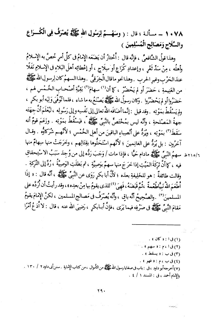 ١٠٧٨ - مسألة؛ قال: (وسَهْمٌ لِرَسُولِ اللَّهِ -صلى اللَّه عليه وسلم- يُصْرَف فِى الْكُرَاعِ والسِّلَاحِ وَمَصَالِح الْمُسْلِمِينَ)