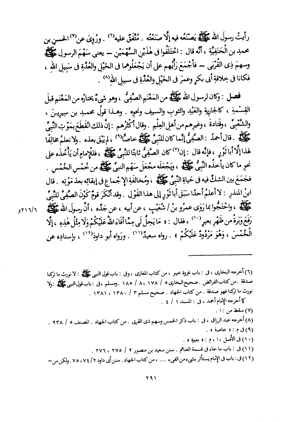 رَأَيْتُ رسولَ اللَّه -صلى اللَّه عليه وسلم- يَصْنَعُه فيه إلَّا صَنَعْتُه. مُتَّفَقٌ عليه (٦). ورُوِىَ عن (٧) الحسنِ بن محمدِ بن الْحَنَفِيَّةِ، أنَّه قال: اخْتَلَفُوا فى هذَيْنِ السَّهْمَيْنِ -يعنى سَهْمَ الرسولِ -صلى اللَّه عليه وسلم- وسهمَ ذِى القُرْبَى- فأجْمَعَ رَأَيُهم على أن يَجْعَلُوهما فى الخَيْلِ والعُدَّةِ فى سَبِيلِ اللَّهِ، فكانا فى خِلافةِ أبى بكرٍ وعمرَ فى الخَيْلِ والعُدَّةِ فى سبيلِ اللَّهِ (٨).