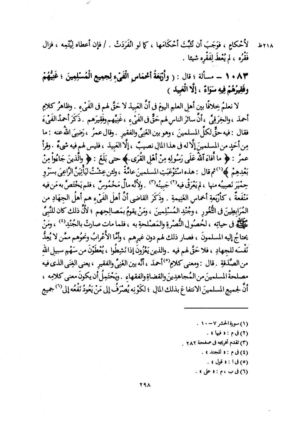 ١٠٨٣ - مسألة؛ قال: (وأَرْبَعَةُ أَخْمَاسِ الْفَىْءِ لِجمِيعِ الْمُسْلِمِينَ؛ غَنِيُّهُمْ وفَقيِرُهُمْ فِيهِ سَوَاءٌ، إلَّا الْعَبِيدَ)