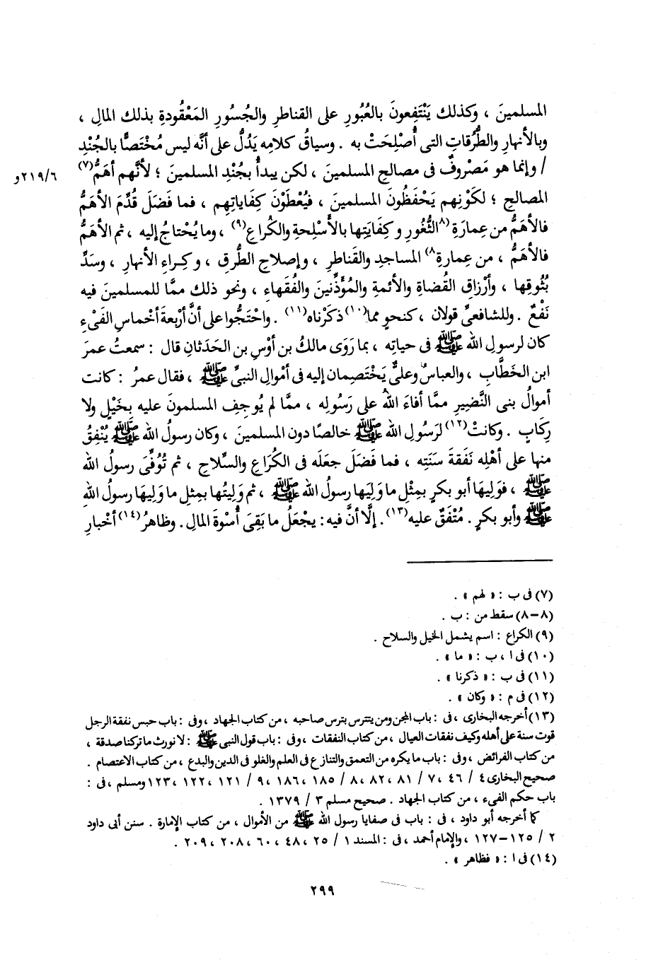المسلمينَ، وكذلك يَنْتَفِعونَ بالعُبُورِ على القناطرِ والجُسُورِ المَعْقُودةِ بذلك المالِ، وبالأنهارِ والطُّرُقاتِ التى أُصْلِحَتْ به. وسياقُ كلامِه يَدُلُّ على أنَّه ليس مُخْتَصًّا بالجُنْدِ وإنما هو مَصْروفٌ فى مصالحِ المسلمينَ، لكن يبدأُ بجُنْدِ المسلمينَ؛ لأنَّهم أهَمُّ (٧) المصالحِ؛ لكَوْنِهم يَحْفَظُونَ المسلمينَ، فيُعْطوْنَ كِفَاياتِهِم، فما فَضَلَ قُدِّمَ الأهَمُّ فالأهَمُّ من عِمارَةِ [الثُّغُورِ وكِفَايَتِها بالأَسْلِحةِ والكُراعِ (٨)، وما يُحْتاجُ إليه، ثم الأهَمُّ فالأهَمُّ، من عِمارةِ] (٩) المساجدِ والقَناطرِ، وإصلاحِ الطُّرقِ، وكِراءِ الأنهارِ، وسَدِّ بُثُوقِها، وأرْزاقِ القُضاةِ والأئمةِ والمُؤَذِّنينَ والفُقَهاءِ، ونحو ذلك ممَّا للمسلمينَ فيه نَفْعٌ. وللشافعىِّ قولان، كنحوٍ مما (١٠) ذكَرْناه (١١). واحْتَجُّوا على أَنَّ أرْبعةَ أخْماسِ الفَىْءِ كان لرسولِ اللَّه -صلى اللَّه عليه وسلم- فى حياتِه، بما رَوَى مالكُ بن أوْسِ بن الحَدَثانِ قال: سمعتُ عمرَ ابن الخَطَّابِ، والعباسُ وعلىٌّ يَخْتَصِمان إليه فى أمْوالِ النبىِّ -صلى اللَّه عليه وسلم-، فقال عمرُ: كانت أموالُ بنى النَّضِيرِ ممَّا أفاءَ اللَّه على رَسُولِه، ممَّا لم يُوجِفِ المسلمونَ عليه بخَيْلٍ ولا رِكَابٍ. وكانتْ (١٢) لرَسُولِ اللَّه -صلى اللَّه عليه وسلم- خالصًا دون المسلمينَ، وكان رسولُ اللَّه -صلى اللَّه عليه وسلم- يُنْفِقُ منها على أهْلِه نَفَقةَ سَنَتِه، فما فَضَلَ جعَلَه فى الكُرَاعِ والسِّلاحِ، ثم تُوُفِّىَ رسولُ اللَّه -صلى اللَّه عليه وسلم-، فوَلِيهَا أبو بكرٍ بمِثْلِ ما وَلِيَها رسولُ اللَّه -صلى اللَّه عليه وسلم-، ثم وَلِيتُها بمِثلِ ما وَلِيهَا رسولُ اللَّه -صلى اللَّه عليه وسلم- وأبو بكرٍ. مُتْفَقٌ عليه (١٣). إلَّا أَنَّ فيه: يجْعَلُ ما بَقِىَ أُسْوةَ المالِ. وظاهرُ (١٤) أخْبارِ