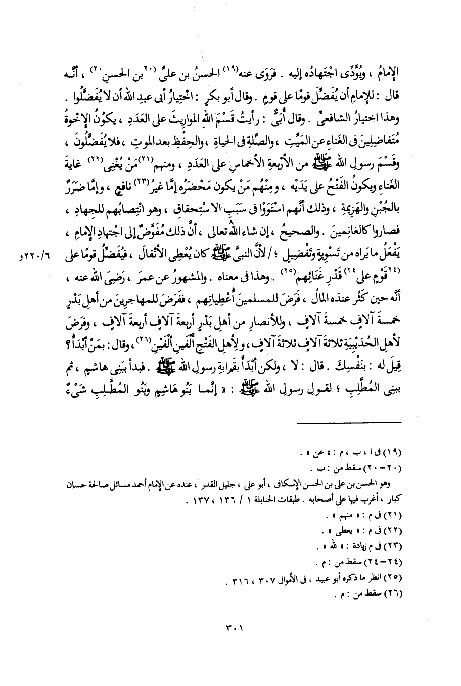 الإِمامُ، ويُؤَدِّى اجْتَهادُه إليه. فرَوَى عنه (١٩) الحسنُ بن علىِّ [بن الحسنِ] (٢٠)، أنَّه قال: للإِمامِ أن يُفَضِّلَ قومًا على قومٍ. وقال أبو بكرٍ: اخْتِيارُ أبى عبدِ اللَّه أن لا يُفَضَّلُوا. وهذا اختيارُ الشافعىِّ. وقال أُبَىٌّ: رأيتُ قَسْمَ اللَّه الموارِيثَ على العَدَدِ، يكوُنُ الإِخْوةُ مُتَفاضِلِينَ فى الغَناء عن المَيِّتِ، والصِّلةِ فى الحياةِ، والحِفْظِ بعد الموتِ، فلا يُفَضَّلُونَ، وقَسْمَ رسولِ اللَّه -صلى اللَّه عليه وسلم- من الأرْبعةِ الأخماسِ على العَدَدِ، ومنهم (٢١) مَنْ يُغْنِى (٢٢) غايةَ الغَناءِ ويكونُ الفَتْحُ على يَدَيْه، ومِنْهُم مَنْ يكون مَحْضَرُه إمَّا غيرُ (٢٣) نافعٍ، وإمَّا ضَرَرٌ بالجُبْنِ والهَزِيمةِ، وذلك أنَّهم اسْتَوَوْا فى سَبَب الاسْتِحقاقِ، وهو انْتِصابُهم للجِهادِ، فصاروا كالغانِمينَ. والصحيحُ، إن شاء اللَّهُ تعالى، أَنَّ ذلك مُفَوَّضٌ إلى اجْتهادِ الإِمامِ، يَفْعَلُ ما يَراه من تَسْوِيةٍ وتَفْضِيلٍ؛ لأنَّ النبىَّ -صلى اللَّه عليه وسلم- كان يُعْطِى الأنفالَ، فيُفَضِّلُ قومًا على [قَوْمٍ على] (٢٤) قَدْرِ غَنَائِهم (٢٥). وهذا فى معناه. والمشهورُ عن عمرَ، رَضِىَ اللَّهُ عنه، أنَّه حين كثُر عندَه المالُ، فرَضَ للمسلمينَ أُعْطِياتِهم، ففَرَضَ للمهاجرِينَ من أهلِ بَدْرٍ خمسةَ آلافٍ خمسةَ آلافٍ، وللأنصارِ من أهلِ بَدْرٍ أربعةَ آلافٍ أربعةَ آلافٍ، وفرَضَ لأهلِ الحُدَيْبِيَةِ ثلاثةَ آلافٍ ثلاثةَ آلافٍ، ولِأهلِ الفَتْحِ أَلْفَينِ ألْفَيْنِ (٢٦)، وقال: بمَن أبْدَأُ؟ قِيلَ له: بنَفْسِكَ. قال: لا، ولكن أبْدَأُ بقَرابةِ رسولِ اللَّه -صلى اللَّه عليه وسلم-. فبدأ ببَنِى هاشمٍ، ثم ببَنِى المُطَّلِبِ؛ لقولِ رسولِ اللَّه -صلى اللَّه عليه وسلم-: "إنَّما بَنُو هَاشِمٍ وبَنُو المُطَّلِبِ شَىْءٌ