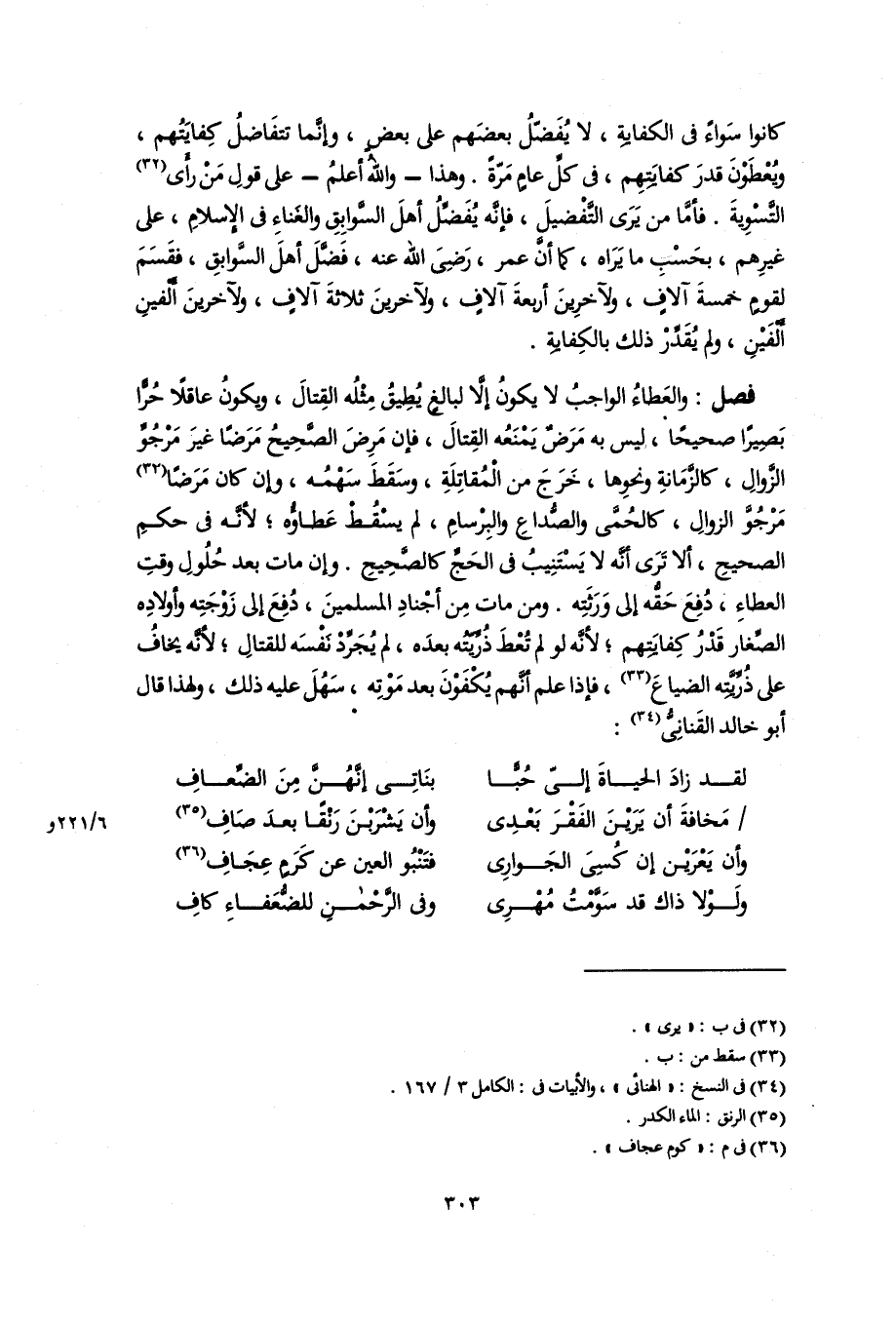 كانوا سَواءً فى الكفايةِ، لا يُفَضّلُ بعضَهم على بعضٍ، وإنَّما تتفَاضلُ كِفايَتُهم، ويُعْطَوْنَ قدرَ كفايَتِهِم، فى كلِّ عامٍ مَرّةً. وهذا -واللَّه أعلمُ- على قولِ مَنْ رأَى (٣٢) التَّسْوِيةَ. فأمَّا من يَرَى التَّفْضيلَ، فإنَّه يُفَضِّلُ أهلَ السَّوابِقِ والغَناءِ فى الإِسلامِ، على غيرِهم، بحَسْبِ ما يَرَاه، كما أَنَّ عمر، رَضِىَ اللَّهُ عنه، فَضَّلَ أهلَ السَّوابقِ، فقَسَمَ لقومٍ خمسةَ آلافٍ، ولأخرِينَ أربعةَ آلافٍ، ولآخرينَ ثلاثةَ آلافٍ، ولآخرينَ أَلْفينِ أَلْفَيْنِ، ولم يُقَدِّرْ ذلك بالكِفايةِ.