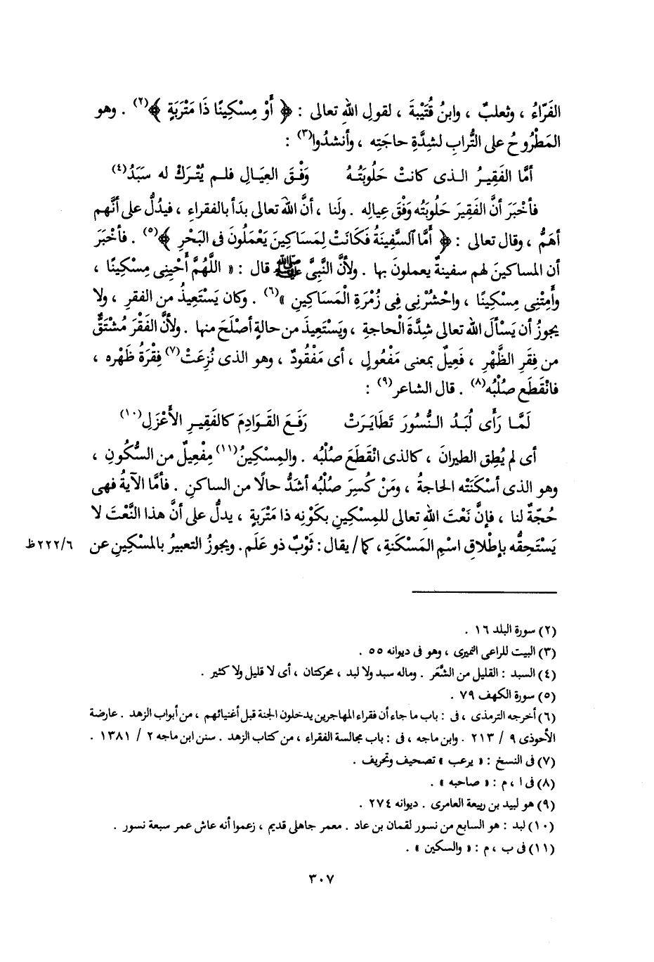 فأخْبَرَ أَنَّ الفَقِيرَ حَلُوبَتُه وَفْقَ عِيالِه. ولَنا، أَنَّ اللَّه تعالى بدَأ بالفقراءِ، فيدُلُّ على أنَّهم أهَمُّ، وقال تعالى: {أَمَّا السَّفِينَةُ فَكَانَتْ لِمَسَاكِينَ يَعْمَلُونَ فِى الْبَحْرِ} (٥). فأخْبَرَ أن المساكينَ لهم سفينةٌ يعملونَ بها. ولأنَّ النَّبِىَّ -صلى اللَّه عليه وسلم- قال: "اللَّهُمَّ أَحْيِنِى مِسْكِينًا، وأَمِتْنِى مِسْكِينًا، واحْشُرْنِى فِى زُمْرَةِ الْمَسَاكِينِ" (٦). وكان يَسْتَعِيذُ من الفقرِ، ولا يجوزُ أن يَسْألَ اللَّه تعالى شِدَّةَ الْحاجةِ، ويَسْتَعِيذَ من حالةٍ أصْلَحَ منها. ولأنَّ الفَقْرَ مُشْتَقٌّ من فِقَرِ الظَّهْرِ، فَعِيلٌ بمعنى مَفْعُولٍ، أى مَفْقُودٌ، وهو الذى نُزِعَتْ (٧) فِقْرَةُ ظَهْره، فانْقَطَع صُلْبُه (٨). قال الشاعر (٩):