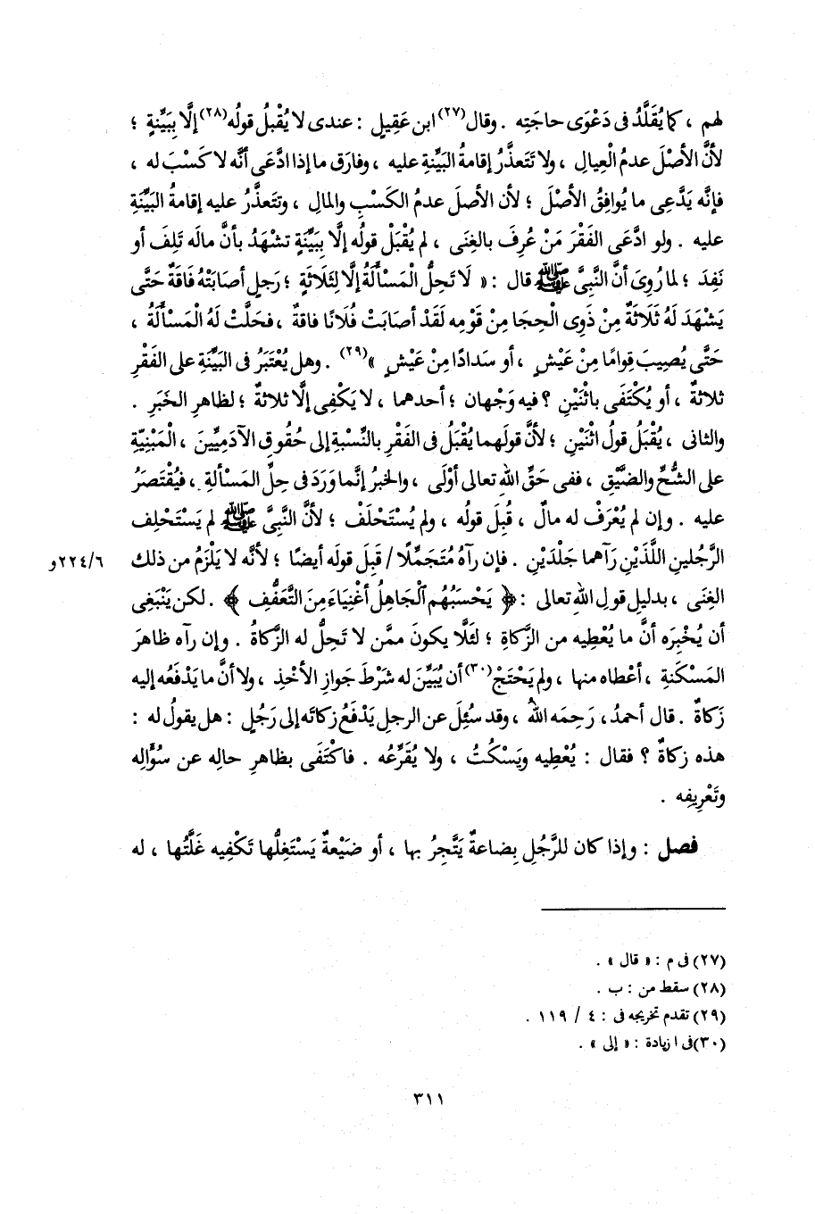 لهم، كما يُقَلَّدُ فى دَعْوَى حاجَتِه. وقال (٢٧) ابن عَقِيلٍ: عندى لا يُقْبلُ قولُه (٢٨) إلَّا بِبَيِّنةٍ؛ لأنَّ الأصْلَ عدمُ الْعِيالِ، ولا تَتَعذَّرُ إقامةُ البَيِّنةِ عليه، وفارَق ما إذا ادَّعَى أنَّه لا كَسْبَ له، فإنَّه يَدَّعِى ما يُوافِقُ الأصْلَ؛ لأنَّ الأصلَ عدمُ الكَسْبِ والمالِ، وتتَعذَّرُ عليه إقامةُ البَيِّنَةِ عليه. ولو ادَّعَى الفَقْرَ مَنْ عُرِفَ بالغِنَى، لم يُقْبَلْ قولُه إلَّا بِبَيِّنَةٍ تشْهَدُ بأنَّ مالَه تَلِفَ أو نَفِدَ؛ لما رُوِىَ أَنَّ النَّبِىَّ -صلى اللَّه عليه وسلم- قال: "لَا تَحِلُّ الْمَسْأَلَةُ إلَّا لِثَلَاثَةٍ؛ رَجلٍ أصَابَتْهُ فَاقَةٌ حَتَّى يَشْهَدَ لَهُ ثَلَاثَةٌ مِنْ ذَوِى الْحِجَا مِنْ قَوْمِه لَقَدْ أصَابَتْ فُلَانًا فاقةٌ، فحَلَّتْ لَهُ الْمَسْأَلَةُ، حَتَّى يُصِيبَ قِوامًا مِنْ عَيْشٍ، أو سَدادًا مِنْ عَيْشٍ" (٢٩). وهل يُعْتَبَرُ فى البَيِّنَةِ على الفَقْرِ ثلاثةٌ، أو يُكْتَفَى باثْنَيْنِ؟ فيه وَجْهان؛ أحدهما، لا يَكْفِى إلَّا ثلاثةٌ؛ لظاهرِ الخبَرِ. والثانى، يُقْبَلُ قولُ اثْنَيْنِ؛ لأنَّ قولَهما يُقْبَلُ فى الفَقْرِ بالنِّسْبةِ إلى حُقُوقِ الآدَمِيِّينَ، الْمَبْنِيّةِ على الشُّحِّ والضَّيْقِ، ففى حَقِّ اللَّهِ تعالى أوْلَى، والخبرُ إنَّما وَرَدَ فى حِلِّ المَسْألةِ، فيُقْتَصَرُ عليه. وإن لم يُعْرَفْ له مالٌ، قُبِلَ قولُه، ولم يُسْتَحْلَفْ؛ لأنَّ النَّبِىَّ -صلى اللَّه عليه وسلم- لم يَسْتَحْلِف الرَّجُلينِ اللَّذَيْنِ رَآهما جَلْدَيْنِ. فإن رآهُ مُتَجَمِّلًا قَبِلَ قولَه أيضًا؛ لأنَّه لا يَلْزَمُ من ذلك الغِنَى، بدليلِ قولِ اللَّهِ تعالى: {يَحْسَبُهُمُ الْجَاهِلُ أَغْنِيَاءَ مِنَ التَّعَفُّفِ}. لكن يَنْبَغِى أن يُخْبِرَه أَنَّ ما يُعْطِيه من الزَّكاةِ؛ لئَلَّا يكونَ ممَّن لا تَحِلُّ له الزَّكاةُ. وإن رآه ظاهرَ المَسْكَنةِ، أعْطاه منها، ولم يَحْتَجْ (٣٠) أن يُبَيِّنَ له شَرْطَ جَوازِ الأخْذِ، ولا أَنَّ ما يَدْفَعُه إليه زَكاةٌ. قال أحمدُ، رَحِمَه اللَّه، وقد سُئِلَ عن الرجلِ يَدْفَعُ زكاتَه إلى رَجُلٍ: هل يقولُ له: هذه زكاةٌ؟ فقال: يُعْطِيه ويَسْكُتُ، ولا يُقَرِّعُه. فاكْتَفَى بظاهرِ حالِه عن سُؤَالِه وتَعْرِيفِه.