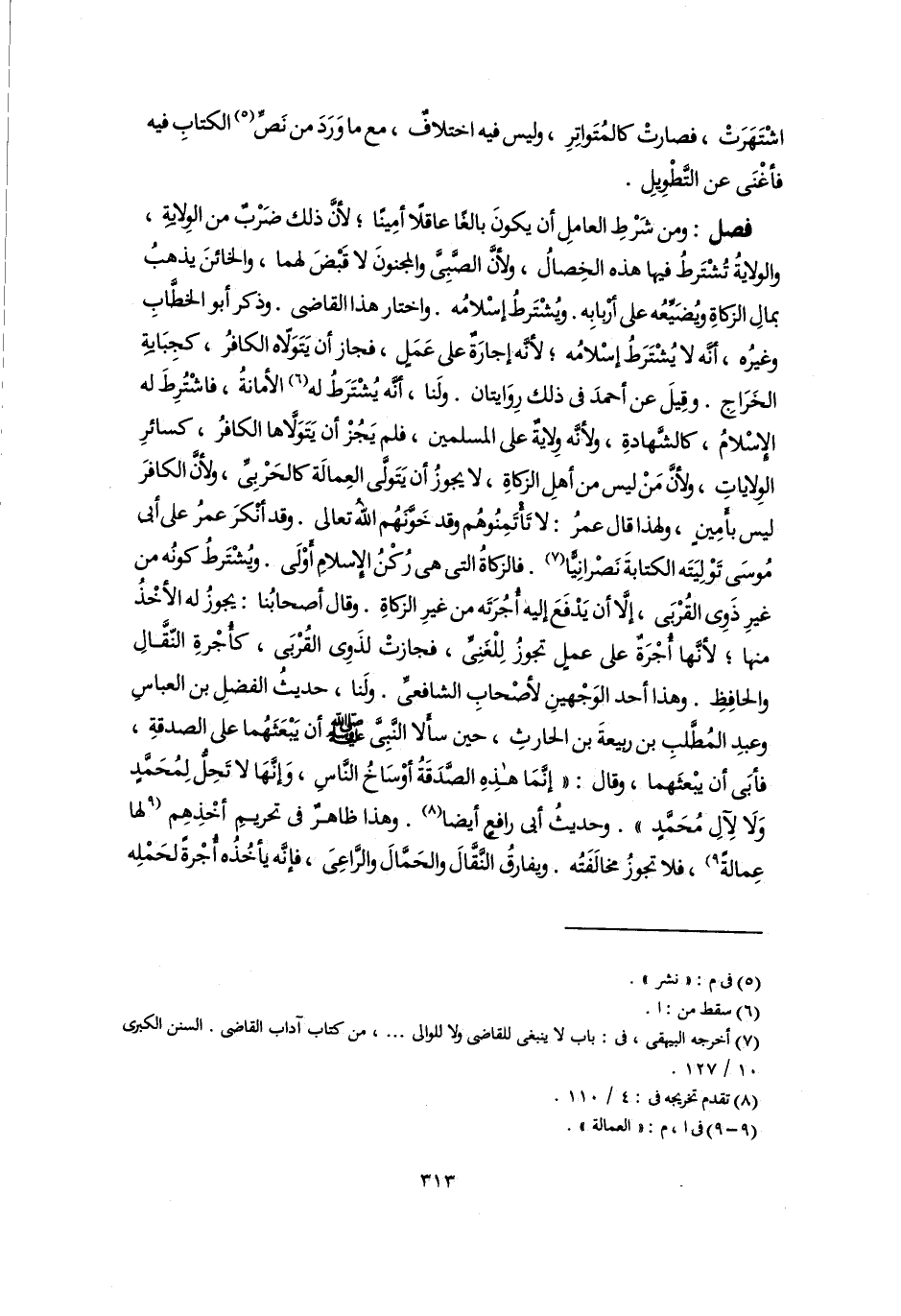 فصل: ومن شَرْطِ العاملِ أن يكونَ بالغًا عاقلًا أمِينًا؛ لأنَّ ذلك ضَرْبٌ من الوِلايةِ، والولايةُ تُشْتَرطُ فيها هذه الخِصالُ، ولأنَّ الصَّبِىَّ والمجنونَ لا قَبْضَ لهما، والخائنَ يذهبُ بمالِ الزكاةِ ويُضَيِّعُه على أرْبابِه. ويُشْتَرطُ إسْلامُه. واختار هذا القاضى. وذكر أبو الخطَّابِ وغيرُه، أنَّه لا يُشْتَرَطُ إسْلامُه؛ لأنَّه إجارَةٌ على عَمَلٍ، فجاز أن يَتَوَلّاه الكافرُ، كجِبَايةِ الخَرَاجِ. وقِيلَ عن أحمدَ فى ذلك رِوَايتان. ولَنا، أنَّه يُشْتَرَطُ له (٦) الأمانةُ، فاشْتُرِطَ له الإِسْلامُ، كالشَّهادةِ، ولأنَّه وِلايةٌ على المسلمين، فلم يَجُزْ أن يَتَوَلَّاها الكافرُ، كسائرِ الوِلاياتِ، ولأنَّ مَنْ ليس من أهلِ الزكاةِ، لا يجوزُ أن يَتَولَّى العِمالَة كالحَرْبِىِّ، ولأنَّ الكافرَ ليس بأَمِينٍ، ولهذا قال عمرُ: لا تَأْتَمِنُوهُم وقد خَوَّنَهُم اللَّه تعالى. وقد أنْكرَ عمرُ على أبى مُوسَى تَوْلِيَتَه الكتابةَ نَصْرانِيًّا (٧). فالزكاةُ التى هى رُكْنُ الإِسلامِ أَوْلَى. ويُشْتَرطُ كونُه من غيرِ ذَوِى القُرْبَى، إلَّا أن يَدْفَعَ إليه أُجُرَتَه من غيرِ الزكاةِ. وقال أصحابُنا: يجوزُ له الأخْذُ منها؛ لأنَّها أُجْرَةٌ على عملٍ تجوزُ لِلْغَنِىِّ، فجازتْ لذَوِى القُرْبَى، كأُجْرةِ النّقَّالِ والحافِظِ. وهذا أحد الوَجْهينِ لأصْحابِ الشافعىِّ. ولَنا، حديثُ الفضلِ بن العباسِ وعبدِ المُطَّلبِ بن ربيعةَ بن الحارثِ، حين سأَلا النَّبِىَّ -صلى اللَّه عليه وسلم- أن يَبْعَثَهُما على الصدقةِ، فأبَى أن يبْعثَهما، وقال: "إنَّمَا هذِهِ الصَّدَقَةُ أوْسَاخُ النَّاس، وَإنَّهَا لا تَحِلُّ لِمُحَمَّدٍ وَلَا لِآلِ مُحَمَّدٍ". وحديثُ أبى رافعٍ أيضًا (٨). وهذا ظاهرٌ فى تحريمِ أخْذِهِم [لها عِمالةً] (٩)، فلا تجوزُ مخالَفَتُه. ويفارقُ النَّقَّالَ والحَمَّالَ والرَّاعِىَ، فإنَّه يأخُذُ أُجْرةً لحَمْلِه
