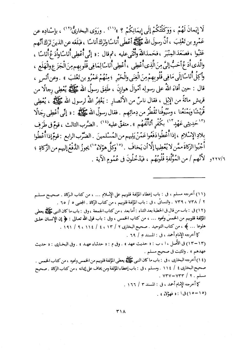 (١١) أخرجه مسلم، فى: باب إعطاء المؤلفة قلوبهم على الإِسلام. . .، من كتاب الزكاة. صحيح مسلم ٢/ ٧٣٨، ٧٣٩. والنسائى، فى: باب المؤلفة قلوبهم، من كتاب الزكاة. المجتبى ٥/ ٦٥.