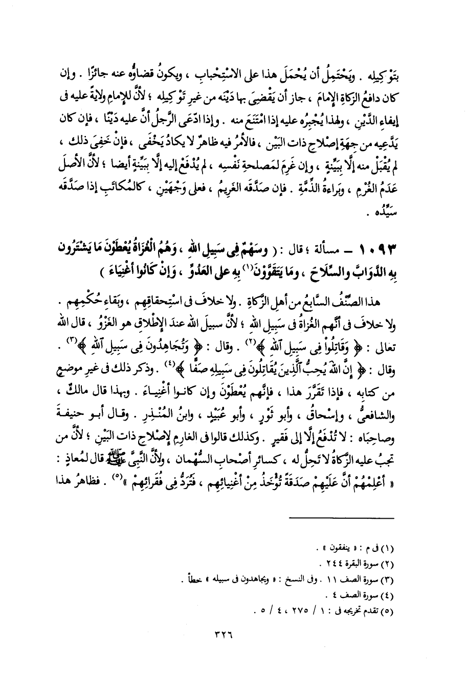هذا الصِّنْفُ السَّابِعُ من أهلِ الزَّكاةِ. ولا خلافَ فى اسْتِحقاقِهِم، وبَقاءِ حُكْمِهِم. ولا خلافَ فى أنَّهم الغُزاةُ فى سَبِيلِ اللَّهِ؛ لأنَّ سبيلَ اللَّه عندَ الإِطْلاقِ هو الغَزْوُ، قال اللَّه تعالى: {وَقَاتِلُوا فِى سَبِيلِ اللَّهِ} (٢). وقال: {وَتُجَاهِدُونَ فِى سَبِيلِ اللَّهِ} (٣). وقال: {إِنَّ اللَّهَ يُحِبُّ الَّذِينَ يُقَاتِلُونَ فِى سَبِيلِهِ صَفًّا} (٤). وذكر ذلك فى غيرِ موضعٍ من كتابِه، فإذا تَقَرَّرَ هذا، فإنَّهم يُعْطَوْنَ وإن كانوا أغْنِياءَ. وبهذا قال مالكٌ، والشافعىُّ، وإسْحاقُ، وأبو ثَوْرٍ، وأبو عُبَيْدٍ، وابنُ المُنْذِرِ. وقال أبو حنيفةَ وصاحِبَاه: لا تُدْفَعُ إلَّا إلى فَقيرٍ. وكذلك قالوا فى الغارِمِ لإِصْلاحِ ذات البَيْنِ؛ لأنَّ من تجبُ عليه الزَّكاةُ لا تَحِلُّ له، كسائرِ أصْحابِ السُّهْمان، ولأنَّ النَّبِىَّ -صلى اللَّه عليه وسلم- قال لمُعاذٍ: "أعْلِمْهُمْ أَنَّ عَلَيْهِمْ صَدَقَةً تُؤْخَذُ مِنْ أغْنِيائِهِم، فَتُرَدُّ فِى فُقَرائِهِمْ" (٥). فظاهرُ هذا