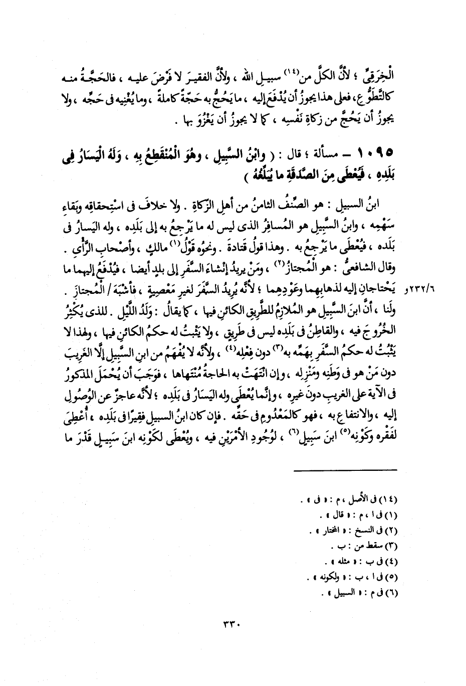 ابنُ السبيلِ: هو الصِّنفُ الثامنُ من أهلِ الزّكاةِ. ولا خلافَ فى اسْتِحقاقِه وبَقاءِ سَهْمِه، وابنُ السَّبِيلِ هو المُسافِرُ الذى ليس له ما يَرْجِعُ به إلى بَلَدِه، وله اليَسارُ فى بَلَده، فيُعْطَى ما يَرْجِعُ به. وهذا قولُ قَتادةَ. ونحوُه قَوْلُ (١) مالكٍ، وأصْحابِ الرَّأْىِ. وقال الشافعىُّ: هو الْمُجتازُ (٢)، ومَنْ يريدُ إنْشاءَ السَّفَرِ إلى بلدٍ أيضًا، فيُدْفَعُ إليهما ما يَحْتاجانِ إليه لذهابِهِما وعَوْدِهِما؛ لأنَّه يُرِيدُ السَّفَرَ لغيرِ مَعْصِيةٍ، فأشْبَهَ الْمُجتازَ. ولَنا، أَنَّ ابنَ السَّبِيلِ هو المُلازِمُ للطَّرِيقِ الكائنِ فيها، كما يقالُ: وَلَدُ اللَّيْلِ. للذى يُكْثِرُ الخُرُوجَ فيه، والقاطِنُ فى بَلَدِه ليس فى طَرِيقٍ، ولا يَثْبتُ له حكمُ الكائنِ فها، ولهذا لا يَثْبُتُ له حكمُ السَّفَرِ بِهَمِّه به (٣) دون فِعْلِه (٤)، ولأنَّه لا يُفْهَمُ من ابنِ السَّبِيلِ إلَّا الغَرِيبَ دون مَنْ هو فى وَطَنِه ومَنْزِلِه، وإن انْتَهَتْ به الحاجةُ مُنْتَهاها، فوَجَبَ أن يُحْمَلَ المذكورُ فى الآية على الغريبِ دونَ غيرِه، وإنَّما يُعْطَى وله اليَسَارُ فى بَلَدِه؛ لأنَّه عاجزٌ عن الوُصُولِ إليه، والانتفاعِ به، فهو كالمَعْدُومِ فى حَقِّه. فإن كان ابنُ السبيلِ فقِيرًا فى بَلَدِه، أُعْطِىَ لفَقْره وكَوْنِه (٥) ابنَ سَبِيلٍ (٦)، لوُجُودِ الأمْرَيْنِ فيه، ويُعْطَى لكَوْنِه ابنَ سَبِيلٍ قَدْرَ ما
