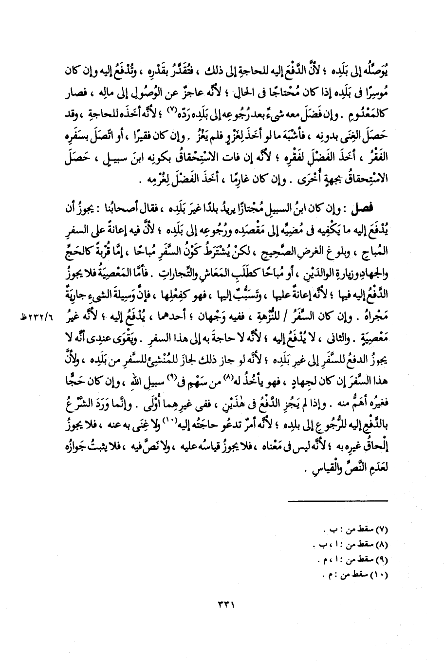 فصل: وإن كان ابنُ السبيلِ مُجْتازًا يريدُ بلدًا غيرَ بَلَدِه، فقال أصحابُنا: يجوزُ أن يُدْفَعَ إليه ما يَكْفِيه فى مُضِيِّه إلى مَقْصَدِه ورُجُوعِه إلى بَلَدِه؛ لأنَّ فيه إعانةً على السفرِ المُباحِ، وبلوغ الغرضِ الصَّحِيحِ، لكنْ يُشْتَرَطُ كَوْنُ السَّفَرِ مُباحًا، إمَّا قُرْبةً كالحَجِّ والجهادِ وزيارةِ الوالدَيْنِ، أو مُباحًا كطَلَبِ المَعَاشِ والتِّجاراتِ. فأمَّا المَعْصِيَةُ فلا يجوز الدَّفْعُ إليه فيها؛ لأنَّه إعانةٌ عليها، وتَسَبُّبٌ إليها، فهو كفِعْلِها، فإنَّ وَسِيلةَ الشىءِ جارِيَةٌ مَجْراهُ. وإن كان السَّفَرُ للنُّزْهةِ، ففيه وَجْهان؛ أحدهما، يُدْفَعُ إليه؛ لأنَّه غيرُ مَعْصِيَةٍ. والثانى، لا يُدْفَعُ إليه؛ لأنَّه لا حاجةَ به إلى هذا السفرِ. ويَقْوَى عندِى أنَّه لا يجوزُ الدفعُ للسَّفَرِ إلى غير بَلَدِه؛ لأنَّه لو جاز ذلك لجازَ للمُنْشِئ للسَّفرِ من بَلدِه، ولأنَّ هذا السَّفرَ إن كان لجِهادٍ، فهو يأخُذُ له (٨) من سَهْمِ فى (٩) سبيلِ اللَّه، وان كان حَجًّا فغيرُه أهَمُّ منه. وإذا لم يَجُزِ الدَّفْعُ فى هذَيْن، ففى غيرِهِما أَوْلَى. وإنَّما وَرَدَ الشَّرْعُ بالدَّفْعِ إليه للرُّجُوعِ إلى بلدِه؛ لأنَّه أمرٌ تدعُو حاجَتُه إليه (١٠) ولا غِنَى به عنه، فلا يجوز إلْحاقُ غيرِه به؛ لأنَّه ليس فى مَعْناه، فلا يجوزُ قياسُه عليه، ولا نَصَّ فيه، فلا يثبتُ جَوازُه لعَدَمِ النَّصِّ والْقياسِ.