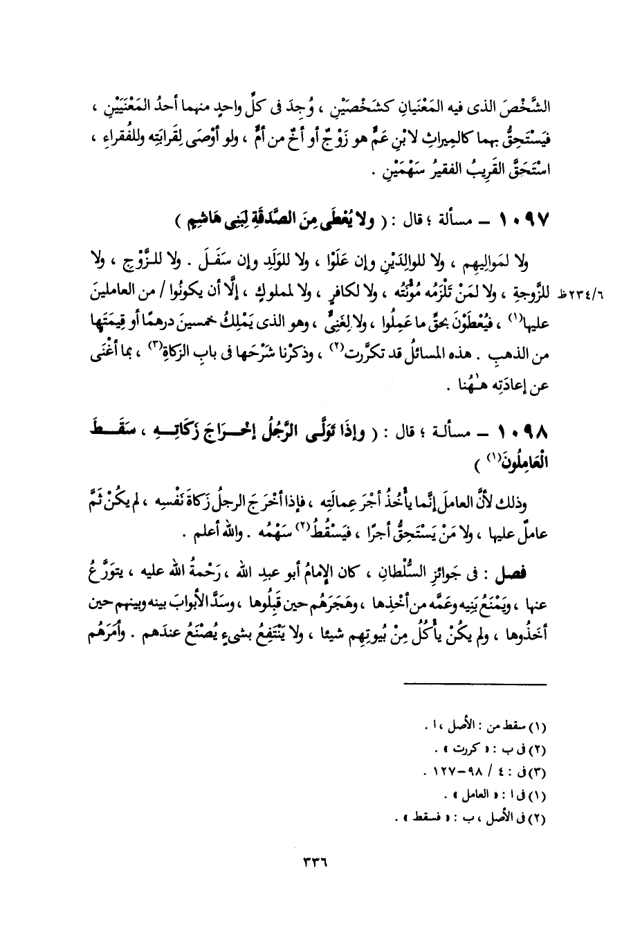 ولا لمَوالِيهِم، ولا للوالِدَيْنِ وإن عَلَوْا، ولا للوَلَدِ وإن سَفَلَ. ولا للزَّوْجِ، ولا للزَّوجةِ، ولا لمَنْ تَلْزَمُه مُؤْنَتُه، ولا لكافرٍ، ولا لمملوكٍ، إلَّا أن يكونُوا من العاملينَ عليها (١)، فيُعْطَوْنَ بحقِّ ما عَمِلُوا، ولا لِغَنِىٍّ، وهو الذى يَمْلِكُ خمسينَ درهمًا أو قِيمَتَها من الذهبِ. هذه المسائلُ قد تكرَّرت (٢)، وذكرْنا شَرْحَها فى بابِ الزكاةِ (٣)، بما أغْنَى عن إعادَتِه ههُنا.