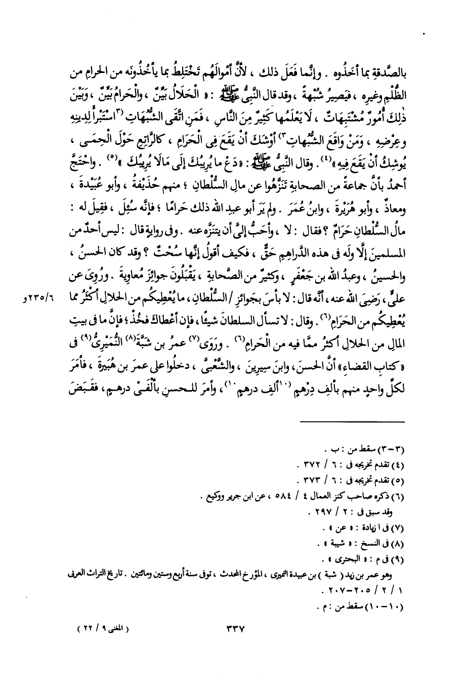 بالصَّدقةِ بما أخَذُوه. وإنَّما فَعَلَ ذلك؛ لأنَّ أمْوالَهُم تَخْتَلِطُ بما يأخُذُونَه من الحرامِ من الظُّلْمِ وغيرِه، فيَصِيرُ شُبْهةً، وقد قال النَّبِىُّ -صلى اللَّه عليه وسلم-: "الْحَلَالُ بَيِّنٌ، والْحَرامُ بَيِّنٌ، وَبَيْنَ ذلِكَ أُمُورٌ مُشْتَبِهَاتٌ، لَا يَعْلَمُها كَثِيرٌ مِنَ النَّاس، فَمَنِ اتَّقَى الشُّبُهَاتِ [اسْتَبْرأَ لِدِينِهِ وعِرْضِهِ، وَمَنْ وَاقَعَ الشُّبُهاتِ] (٣) أوْشَكَ أنْ يَقَعَ فِى الْحَرَامِ، كالرَّاتِعِ حَوْلَ الْحِمَى، يُوشِكُ أنْ يَقَعَ فِيهِ" (٤). وقال النَّبِىُّ -صلى اللَّه عليه وسلم-: "دَعْ ما يُرِيبُكَ إلَى مَا لَا يُرِيبُكَ" (٥). واحْتجَّ أحمدُ بأنَّ جماعةً من الصحابةِ تَنَزَّهُوا عن مالِ السُّلْطانِ؛ منهم حُذَيْفةُ، وأبو عُبَيْدةَ، ومعاذٌ، وأبو هُريرةَ، وابنُ عُمَرَ. ولم يَرَ أبو عبدِ اللَّه ذلك حَرامًا؛ فإنَّه سُئِلَ، فقِيلَ له: مالُ السُّلْطانِ حَرَامٌ؟ فقال: لا، وأحَبُّ إلىَّ أن يتنَزَّه عنه. وفى روايةٍ قال: ليس أحدٌ من المسلمينَ إلَّا ولَه فى هذه الدَّراهِمِ حَقٌّ، فكيف أقولُ إنَّها سُحْتٌ؟ وقد كان الحسنُ، والحسينُ، وعبدُ اللَّه بن جَعْفَرٍ، وكثيرٌ من الصَّحابةِ، يَقْبَلُونَ جوائِزَ مُعاوِيةَ. ورُوِىَ عن علىٍّ، رَضِىَ اللَّهُ عنه، أنَّه قال: لا بأسَ بجَوائزِ السُّلْطانِ، ما يُعْطِيكُم من الحلالِ أكْثَرُ مما يُعْطِيكُم من الحَرَامِ (٦). وقال: لا تسأل السلطانَ شيئًا، فإن أعْطاكَ فخُذْ؛ فإنَّ ما فى بيتِ المالِ من الحلالِ أكثرُ ممَّا فيه من الْحَرامِ (٦). ورَوَى (٧) عمرُ بن شَبَّةَ (٨) النُّمَيْرِىُّ (٩) فى "كتابِ القضاءِ" أَنَّ الحسنَ، وابنَ سِيرِينَ، والشَّعْبىَّ، دخلُوا على عمرَ بن هُبَيرةَ، فأمَرَ لكلِّ واحدٍ منهم بألفِ دِرْهمٍ [ألفِ درهمٍ] (١٠)، وأمرَ للحسنِ بألْفَىْ درهمٍ، فقَبَضَ