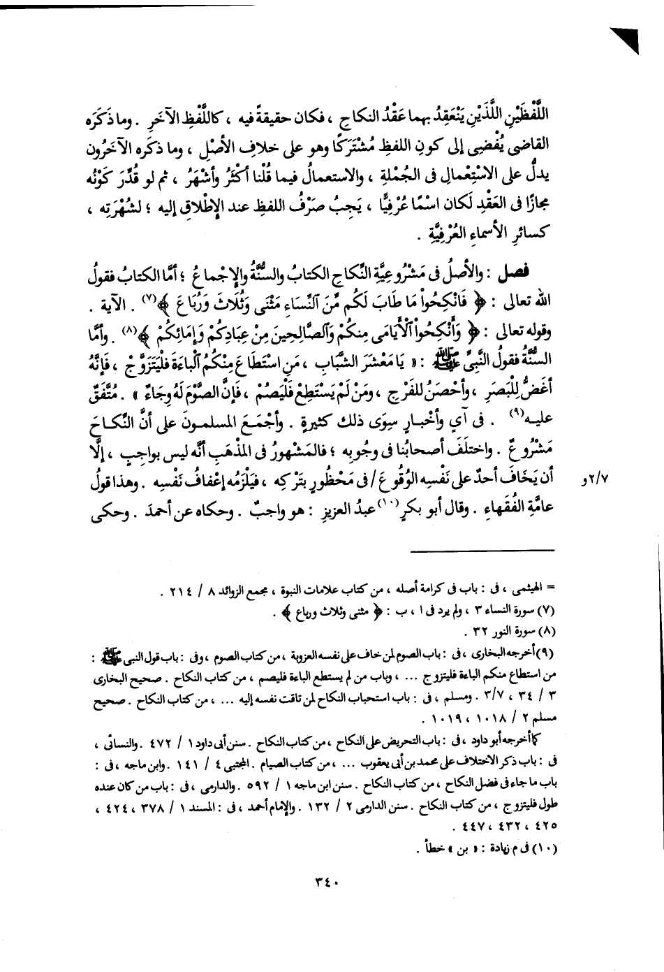 فصل: والأصلُ فى مَشْرُوعِيَّةِ النِّكاحِ الكتابُ والسُّنَّةُ والإِجْماعُ؛ أمَّا الكتابُ فقولُ اللَّه تعالى: {فَانْكِحُوا مَا طَابَ لَكُمْ مِنَ النِّسَاءِ مَثْنَى وَثُلَاثَ وَرُبَاعَ} (٧). الآية. وقوله تعالى: {وَأَنْكِحُوا الْأَيَامَى مِنْكُمْ وَالصَّالِحِينَ مِنْ عِبَادِكُمْ وَإِمَائِكُمْ} (٨). وأمَّا السُّنَّةُ فقولُ النَّبِىِّ -صلى اللَّه عليه وسلم-: "يَا مَعْشَرَ الشَّبَابِ، مَنِ اسْتَطَاعَ مِنْكُمُ الْباءَةَ فلْيَتَزَوَّجْ، فَإنَّهُ أغَضُّ لِلْبَصَرِ، وأحْصَنُ للفَرْجِ، ومَنْ لَمْ يَسْتَطِعْ فَلْيَصُمْ، فَإنَّ الصَّوْمَ لَهُ وِجَاءٌ". مُتَّفَقٌ عليه (٩). فى آىٍ وأخْبارٍ سِوَى ذلك كثيرةٍ. وأجْمَعَ المسلمونَ على أَنَّ النِّكاحَ مَشْرُوعٌ. واختلَفَ أصحابُنا فى وجُوبِه؛ فالمَشْهورُ فى المذْهَبِ أنَّه ليس بواجِبٍ، إلَّا أن يَخَافَ أحدٌ على نَفْسِه الوُقُوعَ فى مَحْظُورٍ بتَرْكِه، فيَلْزَمُه إعْفافُ نَفْسِه. وهذا قولُ عامَّةِ الفُقَهاءِ. وقال أبو بكرٍ (١٠) عبدُ العزيزِ: هو واجبٌ. وحكاه عن أحمدَ. وحكى