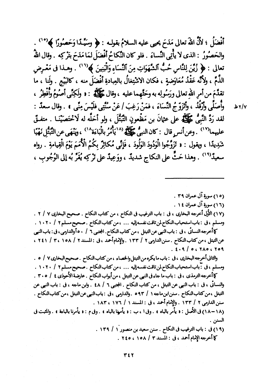 (١٧) الأول أخرجه البخارى، فى: باب الترغيب فى النكاح، من كتاب النكاح. صحيح البخارى ٧/ ٢. ومسلم، فى: باب استحباب النكاح لمن تاقت نفسه إليه. . .، من كتاب النكاح. صحيح مسلم ٢/ ١٠٢٠.