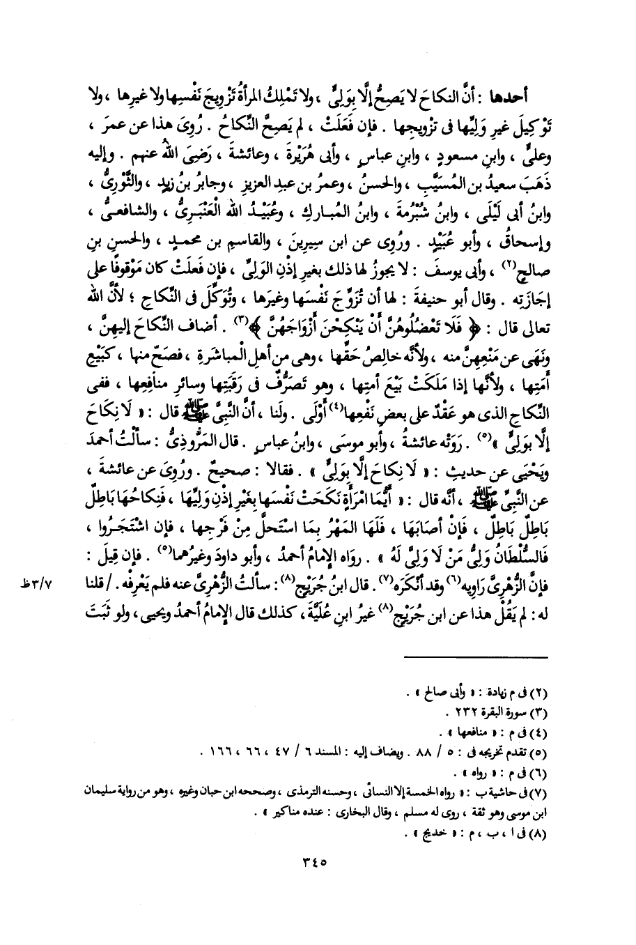 أحدها: أَنَّ النكاحَ لا يَصِحُّ إلَّا بِوَلِىٍّ، ولا تَملِكُ المرأةُ تَزْوِيجَ نفْسِها ولا غيرِها، ولا توْكِيلَ غيرِ وَلِيِّها فى تزْويجِها. فإن فَعَلَتْ، لم يَصِحَّ النِّكاحُ. رُوِىَ هذا عن عمرَ، وعلىٍّ، وابن مسعودٍ، وابنِ عباسٍ، وأبى هُرَيرةَ، وعائشةَ، رَضِىَ اللَّهُ عنهم. وإليه ذهَبَ سعيدُ بن المُسَيَّبِ، والحسنُ، وعمرُ بن عبدِ العزيز، وجابرُ بنُ زيدٍ، والثَّوْرِىُّ، وابنُ أبى لَيلَى، وابنُ شُبْرُمةَ، وابنُ المُباركِ، وعُبَيْدُ اللَّه العَنْبَرِىُّ، والشافعىُّ، وإسحاقُ، وأبو عُبَيْدٍ. ورُوِى عن ابن سِيرِينَ، والقاسمِ بن محمدٍ، والحسنِ بنِ صالحٍ (٢)، وأبى يوسف: لا يجوزُ لها ذلك بغيرِ إذْنِ الوَلِىِّ، فإن فَعلَتْ كان مَوْقوفًا على إجَازَتِه. وقال أبو حنيفةَ: لها أن تُزَوِّجَ نَفْسَها وغيرَها، وتُوَكِّلَ فى النِّكاحِ؛ لأنَّ اللَّه تعالى قال: {فَلَا تَعْضُلُوهُنَّ أَنْ يَنْكِحْنَ أَزْوَاجَهُنَّ} (٣). أضاف النِّكاحَ إليهِنَّ، ونَهَى عن مَنْعِهِنَّ منه، ولأنَّه خالِصُ حَقِّها، وهى من أهلِ المباشَرةِ، فصَحّ منها، كبَيْعِ أمَتِها، ولأنَّها إذا مَلَكَتْ بَيْعَ أمتِها، وهو تَصَرُّفٌ فى رَقَبَتِها وسائرِ منافِعِها، ففى النِّكاحِ الذى هو عَقْدٌ على بعض نَفْعِها (٤) أوْلَى. ولَنا، أنَّ النَّبِىَّ -صلى اللَّه عليه وسلم- قال: "لَا نِكَاحَ إلَّا بوَلِىٍّ" (٥). رَوَته عائشةُ، وأبو موسَى، وابنُ عباسٍ. قال المَرُّوذِىُّ: سألتُ أحمدَ وَيحْيَى عن حديثِ: "لَا نِكاحَ إلا بِوَلِىٍّ". فقالا: صحيحٌ. ورُوِىَ عن عائشةَ، عن النَّبِىِّ -صلى اللَّه عليه وسلم-، أنَّه قال: "أَيُّمَا امْرَأةٍ نَكَحَت نَفْسَها بِغَيْرِ إذنِ وَلِيِّهَا، فَنِكاحُهَا بَاطِلٌ بَاطِلٌ بَاطِلٌ، فَإنْ أصَابَهَا، فَلَهَا المَهْرُ بِمَا اسْتَحلَّ مِنْ فَرْجِها، فإن اشْتَجَرُوا، فَالسُّلْطَانُ وَلِىُّ مَنْ لَا وَلِىَّ لَهُ". روَاه الإمامُ أحمدُ، وأبو داودَ وغيرُهما (٥). فإن قِيلَ: فإن الزُّهْرِى رَاوِيه (٦) وقد أنْكَرَه (٧). قال ابنُ جُرَيْجٍ (٨): سألتُ الزُّهْرِى عنه فلم يَعْرِفْه. قلنا له: لم يَقُلْ هذا عن ابن جُرَيْجٍ (٨) غيرُ ابنِ عُلَيَّةَ، كذلك قال الإمامُ أحمدُ ويحيى، ولو ثَبَتَ