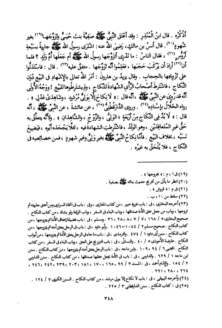 أذْكُرْه. قال ابنُ المُنْذِرِ: وقد أعْتَقَ النَّبِىُّ -صلى اللَّه عليه وسلم- صَفِيَّةَ بنتَ حُيَىٍّ وتَزَوَّجَها (١٩) بغير شُهود (٢٠). قال أنسُ بن مالكٍ، رَضِىَ اللَّهُ عنه: اشتَرَى رسولُ اللَّه -صلى اللَّه عليه وسلم- جارِيةً بسَبْعةِ أرْؤُسٍ (٢١)، فقال الناسُ: ما نَدْرِى أتزَوَّجَها رسولُ اللَّه -صلى اللَّه عليه وسلم- أم جَعَلَها أُمَّ وَلَدٍ؟ فلما أن (٢٢) أرادَ أن يَركَبَ حَجَبَها، فعَلِمُوا أنَّه تَزَوَّجَها. متفقٌ عليه (٢٣). قال: فاسْتَدَلُّوا على تَزْوِيجها بالحِجاب. وقال يزيدُ بن هارونَ: أمَرَ اللَّهُ تعالى بالإشْهادِ فى البَيعِ دُون النِّكاحِ، فاشْتَرطَ أصحابُ الرَّأْىِ الشَّهادةَ للنِّكاحِ، ولم يشتَرِطُوها للبَيْعِ! ووَجْهُ الأُولَى أنَّه قد رُوىَ عن النَّبِىِّ -صلى اللَّه عليه وسلم-، أنَّه قال: "لَا نِكاحَ إلَّا بِولِىٍّ مُرْشِدٍ، وشَاهِدَىْ عَدْلٍ". رواه الخَلَّالُ بإسْنادِه (٢٤). وروى الدَّارَقُطْنِىُّ (٢٥)، عن عائشةَ، عن النَّبِىِّ -صلى اللَّه عليه وسلم-، أنَّه قال: "لَا بُدَّ فِى النِّكَاحِ مِنْ أرْبَعَةٍ؛ الوَلِىُّ، والزَّوْجُ، والشَّاهِدَانِ". ولأنَّه يتعلَّقُ به حَقُّ غيرِ المُتَعاقِدَيْنِ، وهو الوَلَدُ، فاشْتُرِطتِ الشهادةُ فيه، لئلَّا يَجحَدَه أبُوه، فيَضِيعَ نَسَبُه، بخلاف البَيْعِ. فأمَّا نِكاحُ النَّبِىِّ -صلى اللَّه عليه وسلم- بغيرِ وَلِىٍّ وغيرِ شهودٍ، فمن خصائِصِه فى النِّكاحِ، فلا يُلْحَقُ به غيرُه.