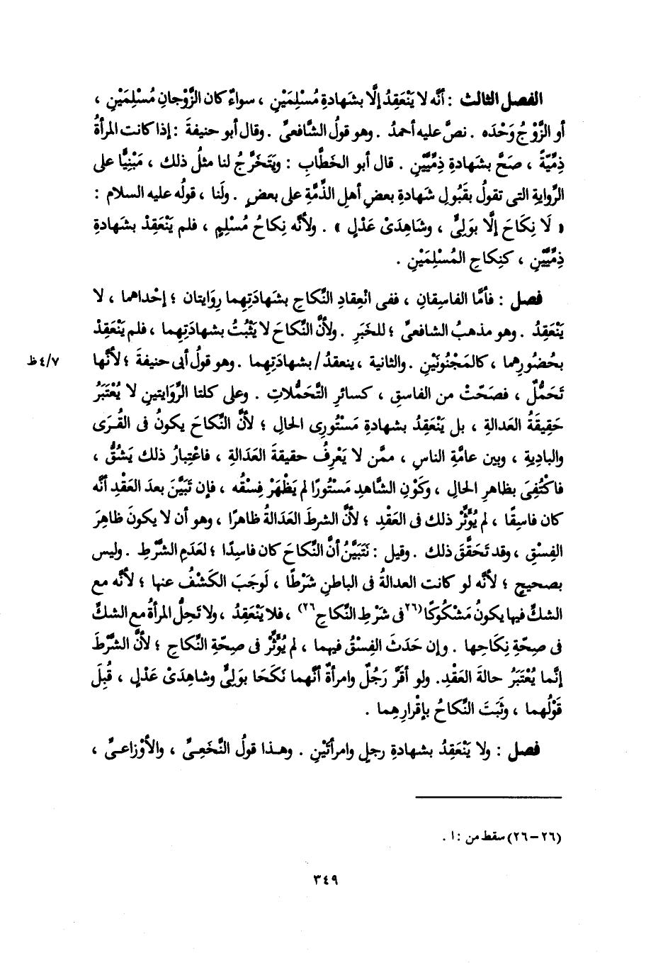 الفصل الثالث: أنَّه لا يَنْعَقِدُ إلَّا بشَهادةِ مُسْلِمَيْنِ، سواءٌ كان الزَّوْجانِ مُسْلِمَيْنِ، أو الزَّوْجُ وَحْدَه. نصَّ عليه أحمدُ. وهو قولُ الشَّافعىِّ. وقال أبو حنيفةَ: إذا كانت المرأةُ ذِمِّيّةً، صَحَّ بشَهادةِ ذِمِّيَّيْنِ. قال أبو الخَطَّابِ: ويَتَخَرَّجُ لنا مثلُ ذلك، مَبْنِيًّا على الرِّواية التى تقولُ بقَبُولِ شَهادةِ بعض أهلِ الذِّمَّةِ على بعضٍ. ولَنا، قولُه عليه السلام: "لَا نِكَاحَ إلَّا بوَلِىٍّ، وشَاهِدَىْ عَدْلٍ". ولأنَّه نِكاحُ مُسْلِمٍ، فلم يَنْعَقِد بشَهادةِ ذِمِّيَّينِ، كنِكاحِ المُسْلِمَيْنِ.