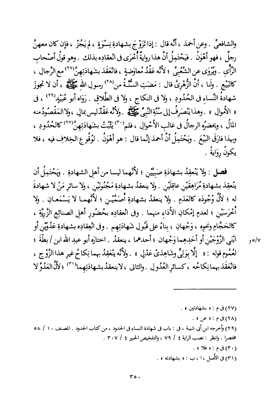 والشافعىٍّ. وعن أحمدَ، أنَّه قال: إذا تَزَوّجَ بشهادةِ نِسْوَةٍ، لم يَجُزْ، فإن كان معهنَّ رجل، فهو أهْوَنُ. فيَحْتَمِلُ أَنَّ هذا روايةٌ أُخْرَى فى انْعقاده بذلك. وهو قولُ أصْحابِ الرَّأْىِ. ويُرْوَى عن الشَّعْبِىِّ؛ لأنَّه عَقْدُ مُعاوَضةٍ، فانْعَقَدَ بشَهادَتِهِنَّ (٢٧) مع الرِّجالِ، كالبَيْعِ. ولَنا، أَنَّ الزُّهْرِىِّ قال: مَضَتِ السُّنَّةُ من (٢٨) رسولِ اللَّهِ -صلى اللَّه عليه وسلم-، أن لا تجوزَ شهادةُ النِّساءِ فى الحُدُودِ، ولا فى النِّكاحِ، ولا فى الطَّلاقِ. رَوَاه أبو عُبَيد (٢٩)، فى "الأموالِ". وهذا يَنْصَرِفُ إلى سُنَّةِ النَّبِىِّ -صلى اللَّه عليه وسلم-. ولأنَّه عَقْدٌ ليس بمالٍ، ولا المَقْصُودُ منه المالُ، ويحضرُه الرجالُ فى غالبِ الأحْوالِ، فلم (٣٠) يَثْبُتْ بشَهادَتِهِنَّ (٢٧) كالحُدُودِ، وبهذا فارَقَ البَيْعَ. ويَحْتَمِلُ أَنَّ أحمدَ إنَّما قال: هو أهْوَنُ. لوُقُوعِ الخِلافِ فيه، فلا يكونُ رِوَايةً.