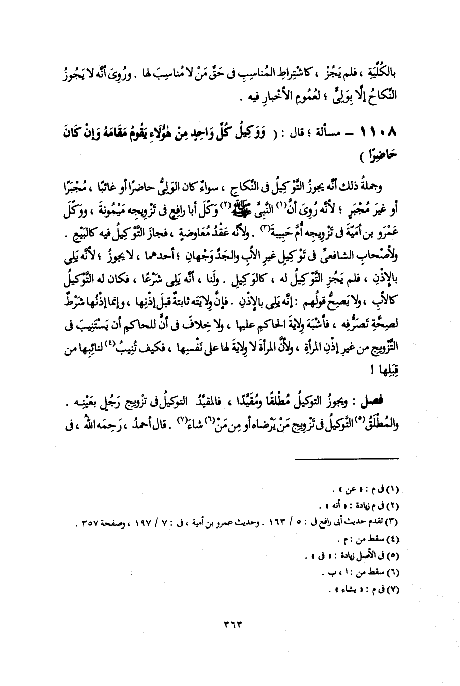 فصل: ويجوزُ التوكيلُ مُطْلقًا ومُقَيَّدًا، فالمقيَّدُ التوكيلُ فى تزْوِيج رَجُلٍ بعَيْنِه. والمُطْلَق (٥) التَّوكيلُ فى تَزْوِيج مَنْ يَرْضاه أو مِن مَنْ (٦) شاءَ (٧). قال أحمدُ، رَحِمَه اللَّهُ، فى