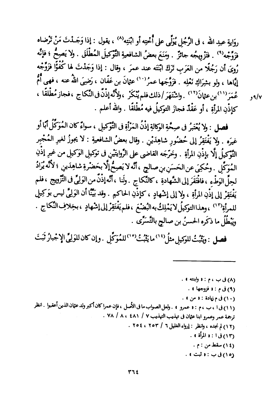 روَايةِ عبدِ اللَّه، فى الرَّجُلِ يُوَلِّى على أُخْتِه أو ابْنَتِه (٨)، يقول: إذا وَجَدْتَ مَنْ تَرْضاه فزَوِّجْه (٩). فتَزْوِيجُه جائزٌ. ومَنَعَ بعضُ الشافعيةِ التَّوْكيلَ المُطْلَقَ. ولا يَصِحُّ؛ فإنَّه رُوىَ أن رَجُلًا من العَرَبِ تَرَكَ ابْنَتَه عند عمرَ، وقال: إذا وَجَدْتَ لها كُفْؤًا فزَوِّجْه إيَّاها، ولو بشِرَاكِ نَعْلِه. فزَوَّجَها عمرُ (١٠) عثمانَ بن عَفّان، رَضِىَ اللَّهُ عنه، فهى أُمُّ عُمَرَ (١١) بن عثمانَ (١٢). واشْتَهَرَ ذلك فلم يُنْكَرْ، ولأنَّه إذْنٌ فى النِّكاحِ، فجاز مُطْلقًا، كإذْنِ المرأةِ، أو عَقْدٌ فجازَ التوكيلُ فيه مُطْلقًا. واللَّه أعلم.