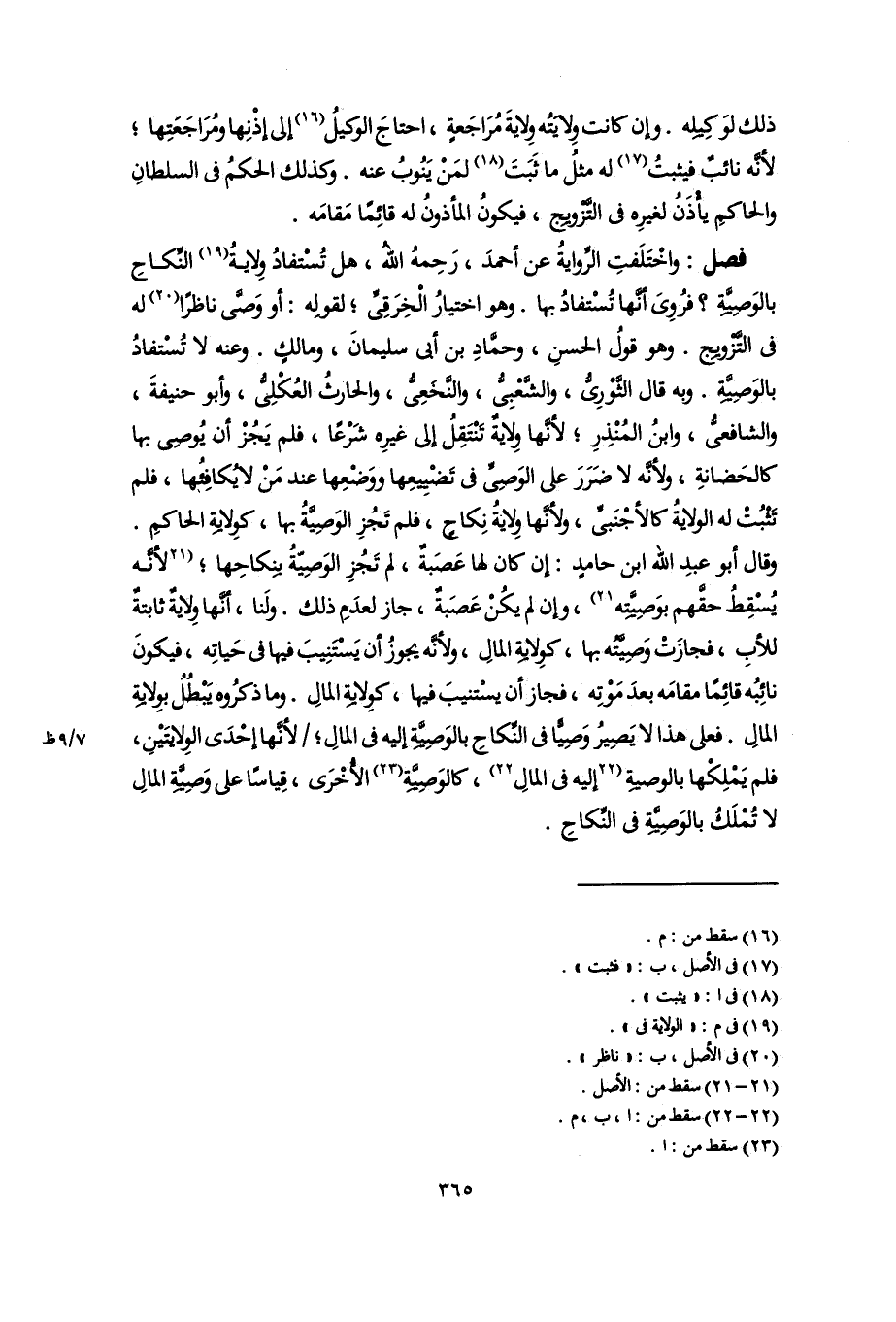 فصل: واخْتَلَفتِ الرِّوايةُ عن أحمدَ، رَحِمهُ اللَّه، هل تُسْتفادُ وِلايةُ (١٩) النِّكاحِ بالوَصِيَّةِ؟ فرُوِىَ أنَّها تُسْتفادُ بها. وهو اختيارُ الْخِرَقِىِّ؛ لقوله: أو وَصَّى ناظرًا (٢٠) له فى التَّزْويج. وهو قولُ الحسنِ، وحمَّادِ بن أبى سليمانَ، ومالكٍ. وعنه لا تُسْتفادُ بالوَصِيَّةِ. وبه قال الثَّوْرِىُّ، والشَّعْبِىُّ، والنَّخَعِىُّ، والحارثُ العُكْلِىُّ، وأبو حنيفةَ، والشافعىُّ، وابنُ المُنْذِرِ؛ لأنَّها وِلايةٌ تَنْتَقِلُ إلى غيرِه شَرْعًا، فلم يَجُزْ أن يُوصِى بها كالحَضانةِ، ولأنَّه لا ضَرَرَ على الوَصِىِّ فى تَضْييعِها ووَضْعِها عند مَنْ لا يُكافِئُها، فلم تَثْبُتْ له الولايةُ كالأجْنَبىِّ، ولأنَّها وِلاية نِكاحٍ، فلم تَجُزِ الوَصِيَّةُ بها، كوِلايةِ الحاكمِ. وقال أبو عبدِ اللَّه ابن حامدٍ: إن كان لها عَصَبةٌ، لم تَجُزِ الوَصِيّةُ بنِكاحِها؛ [لأنَّه يُسْقِطُ حقَّهم بوَصِيَّتِه] (٢١)، وإن لم يكُنْ عَصَبةٌ، جاز لعدَمِ ذلك. ولَنا، أنَّها وِلايةٌ ثابتةٌ للأبِ، فجازَتْ وَصِيَّتُه بها، كوِلاِيةِ المالِ، ولأنَّه يجوزُ أن يَسْتَنِيبَ فيها فى حَياتِه، فيكونَ نائِبُه قائِمًا مقامَه بعدَ مَوْتِه، فجاز أن يسْتنيبَ فيها، كوِلايةِ المالِ. وما ذكرُوه يَبْطُلُ بوِلايةِ المالِ. فعلى هذا لا يَصِيرُ وَصِيًّا فى النِّكاحِ بالوَصِيَّةِ إليه فى المالِ؛ لأنَّها إحْدَى الوِلايتَيْنِ، فلم يَمْلِكْها بالوصيةِ [إليه فى المالِ] (٢٢)، كالوَصِيَّةِ (٢٣) الأُخْرَى، قِياسًا على وَصِيَّةِ المالِ لا تُمْلَكُ بالوَصِيَّةِ فى النِّكاحِ.