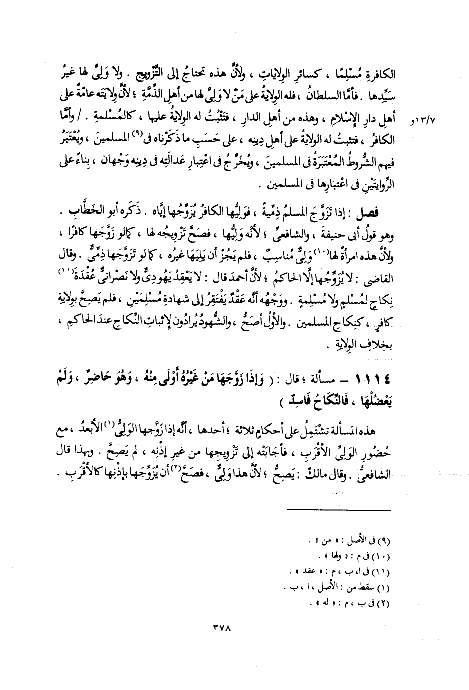 الكافرةِ مُسْلِمًا، كسائرِ الوِلاياتِ، ولأنَّ هذه تحتاجُ إلى التَّزْويج. ولا وَلِىَّ لها غيرُ سَيِّدِها. فأمَّا السلطانُ، فله الوِلايةُ على مَنْ لا وَلِىَّ لها من أهلِ الذِّمَّةِ؛ لأنَّ وِلايَتَه عامَّةٌ على أهلِ دارِ الإسْلامِ، وهذه من أهلِ الدارِ، فتَثْبُتُ له الوِلايةُ عليها، كالمُسْلمةِ. وأمَّا الكافرُ، فتثبتُ له الولايةُ على أهلِ دِينِه، على حَسَبِ ما ذَكَرْناه فى (٩) المسلمينَ، ويُعْتَبَرُ فيهم الشُّروطُ المُعْتَبَرَةُ فى المسلمينَ، ويُخَرجُ فى اعْتِبارِ عَدالَتِه فى دِينِه وَجْهان، بِناءً على الرِّوايتَيْنِ فى اعْتبارِها فى المسلمين.