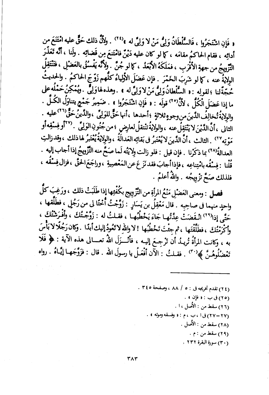 فصل: ومعنى العَضْلِ مَنْعُ المرأةِ من التَّزْوِيج بكُفْئِها إذا طَلَبَتْ ذلك، ورَغِبَ كلُّ واحدٍ منهما فى صاحِبِه. قال مَعْقِلُ بن يَسَارٍ: زَوجْتُ أُخْتًا لى من رَجُلٍ، فطَلَّقها، حَتَّى إذا (٢٩) انْقَضَتْ عِدَّتُها جَاءَ يَخْطُبُها، فقلتُ له: زَوَّجْتُكَ، وأفْرَشتُكَ، وأكْرَمْتُكَ، فطَلَّقْتَها، ثم جِئتَ تَخْطُبُها! لا واللَّهِ لا تَعُودُ إليك أبدًا. وكان رَجُلًا لا بَأْسَ به، وكانت المرأةُ تُريدُ أن ترْجِعَ إليه، فأنزَلَ اللَّهُ تعالى هذه الآية: {فَلَا تَعْضُلُوهُنَّ} (٣٠). فقلتُ: الآن أفْعَلُ يا رسولَ اللَّه. قال: فزَوَّجَها إيَّاهُ. رواه