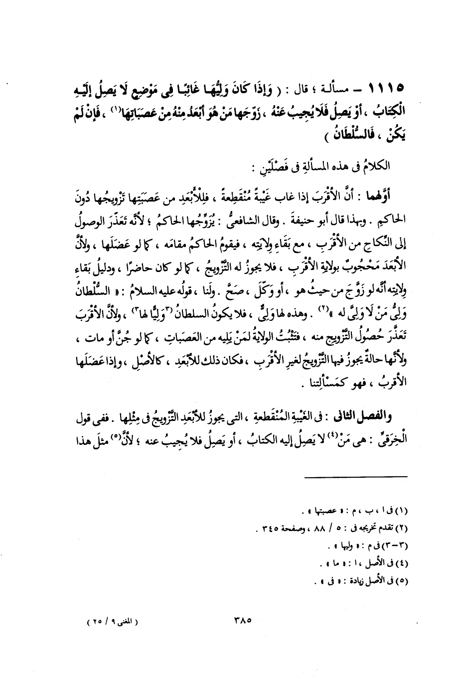 والفصل الثانى: فى الغَيْبةِ المُنْقَطعةِ، التى يجوزُ للأبعَدِ التَّزويجُ فى مِثْلِها. ففى قول الْخِرَقىِّ: هى مَنْ (٤) لا يَصِلُ إليه الكتابُ، أو يَصِلُ فلا يُجِيبُ عنه؛ لأنَّ (٥) مثلَ هذا