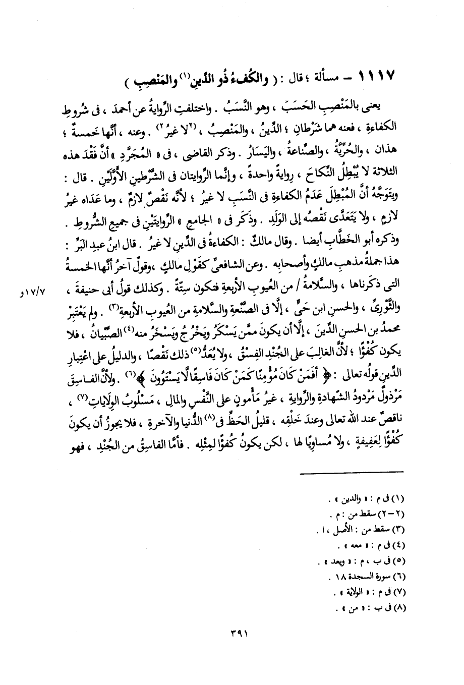 ١١١٧ - مسألة؛ قال: (والكُفءُ ذُو الدِّين (١) والمَنْصِبِ)