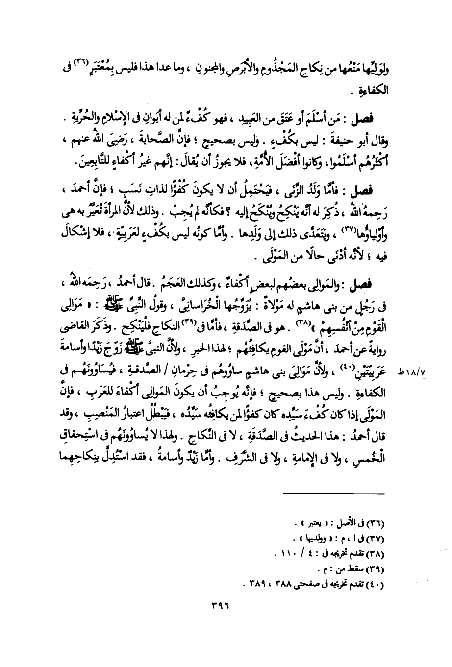 فصل: والمَوالِى بعضُهم لبعضٍ أكفاءٌ، وكذلك العَجَمُ. قال أحمدُ، رَحِمَه اللَّهُ، فى رَجُلٍ من بنى هاشم له مَوْلاةٌ: يُزَوِّجُها الْخُرَاسانى، وقولُ النَّبِىِّ -صلى اللَّه عليه وسلم-: "مَوَالِى القَوْمِ مِنْ أنفُسِهِمْ" (٣٨). هو فى الصدقةِ، فأمَّا فى (٣٩) النِّكاحِ فلْيَنْكِح. وذَكَرَ القاضى روايةً عن أحمدَ، أن مَوْلَى القومِ يكافِئُهُم؛ لهذا الخبرِ، ولأنَّ النبىَّ -صلى اللَّه عليه وسلم- زَوّجَ زَيْدًا وأسامةَ عَرَبِيّتَيْنِ (٤٠)، ولأن مَوَالِىَ بنى هاشمٍ ساوُوهُم فى حِرْمانِ الصَّدقةِ، فيُسَاوُونَهُم فى الكفاءةِ. وليس هذا بصحيحٍ؛ فإنه يُوجِبُ أن يكونَ المَوالِى أكفاءَ للعَرَبِ، فإن المَوْلَى إذا كان كُفْءَ سَيِّده كان كفؤًا لمن يكافِئُه سَيِّدُه، فيَبْطُلُ اعتبارُ المَنْصبٍ، وقد قال أحمدُ: هذا الحديثُ فى الصَّدَقَةِ، لا فى النِّكاحِ. ولهذا لا يُساوُونَهُم فى اسْتِحقاقِ الخُمْسِ، ولا فى الإمامةِ، ولا فى الشَّرَفِ. وأما زيدٌ وأسامةُ، فقد اسْتُدِلَّ بِنكاحِهِما