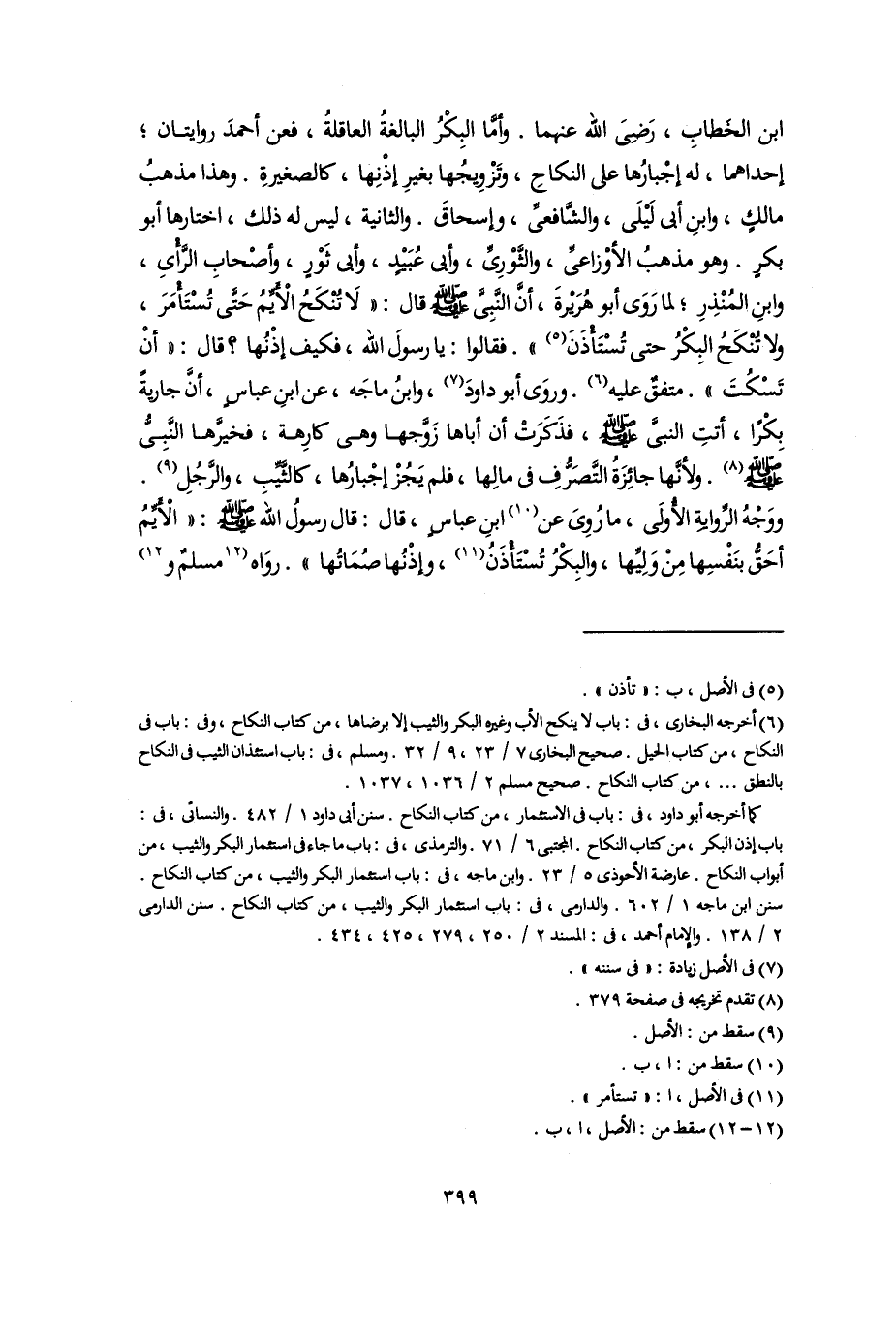 (٦) أخرجه البخارى، فى: باب لا ينكح الأب وغيره البكر والثيب إلا برضاها، من كتاب النكاح، وفى: باب فى النكاح، من كتاب الحيل. صحيح البخارى ٧/ ٢٣، ٩/ ٣٢. ومسلم، فى: باب استئذان الثيب فى النكاح بالنطق. . .، من كتاب النكاح. صحيح مسلم ٢/ ١٠٣٦، ١٠٣٧.