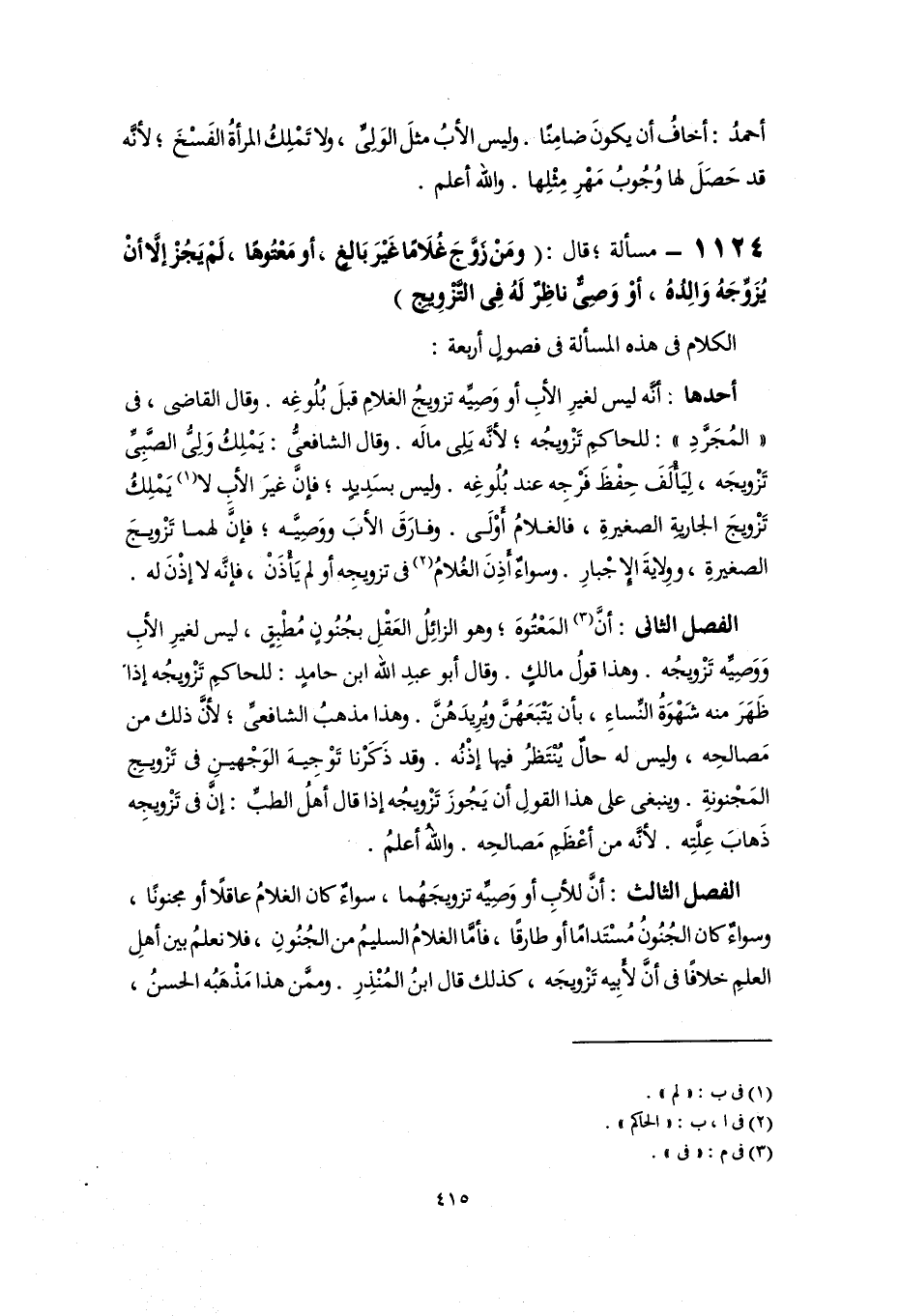الفصل الثالث: أَنَّ للأبِ أو وَصِيِّه تزويجَهُما، سواءٌ كان الغلامُ عاقلًا أو مجنونًا، وسواءٌ كان الجُنُونُ مُسْتَدامًا أو طارقًا، فأمَّا الغلامُ السليمُ من الجُنُونِ، فلا نعلمُ بين أهلِ العلمِ خلافًا فى أَنَّ لأبِيه تَزْويجَه، كذلك قال ابنُ المُنْذِرِ. وممَّن هذا مَذْهَبُه الحسنُ،