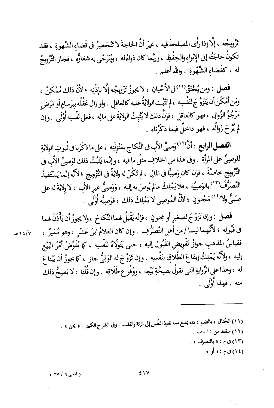 الفصل الرابع: أَنَّ (١٢) وَصِىَّ الأبِ فى النِّكاحِ بمَنْزِلَتِه، على ما ذكَرْنا فى ثُبوتِ الوِلايةِ للوَصِىِّ على المرأةِ. وفى هذا من الخلافِ مثلُ ما فيه، وإنَّما يثْبُتُ ذلك لوَصِىِّ الأبِ فى التَّزْويجِ خاصَّةً، فإن كان وَصِيًّا فى المالِ، لم تَكُنْ له ولايةٌ فى التَّزْويجِ؛ لأنَّه إنَّما يَسْتَفيدُ التَّصَرُّفَ (١٣) بالوَصِيَّةِ، فلا يَمْلِكُ ما لم يُوصَ به إليه، وَوَصِىُّ غيرِ الأبِ، لا وِلايةَ له على صَبِىٍّ ولا (١٤) مَجْنونٍ؛ لأنَّ المُوصِى لا يَمْلِكُ ذلك، فوَصِيُّه أَوْلَى.