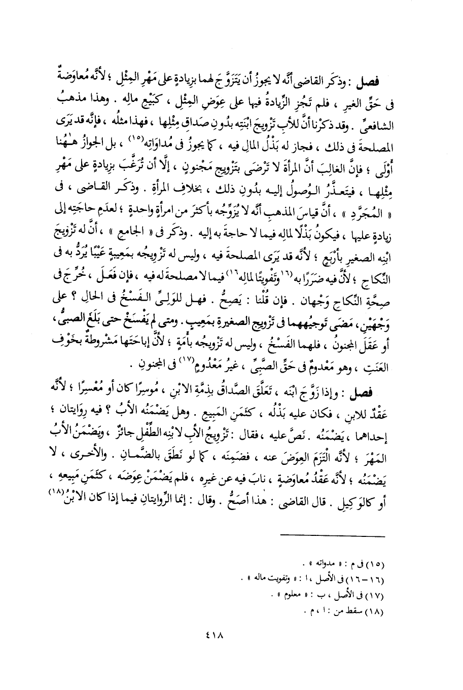 فصل: وذكَر القاضى أَنَّه لا يجوزُ أن يَتَزَوَّجَ لهما بزِيادةٍ على مَهْرِ المِثْلِ؛ لأنَّه مُعاوَضةٌ فى حَقِّ الغيرِ، فلم تَجُزِ الزِّيادةُ فيها على عِوَض المِثْلِ، كبَيْعِ مالِه. وهذا مذهبُ الشافعىِّ. وقد ذكرْنا أَنَّ للأبِ تَزْويجَ ابْنَتِه بدُونِ صَداقِ مِثْلِها، فهذا مثلُه، فإنَّه قد يَرَى المصلحةَ فى ذلك، فجاز له بَذْلُ المالِ فيه، ؛ يجوزُ فى مُداوَاتِه (١٥)، بل الجوازُ ههُنا أوْلَى؛ فإنَّ الغالِبَ أَنَّ المرأةَ لا تَرْضَى بتَزْويج مَجْنونٍ، إلَّا أن تُرَغَبَ بزِيادةٍ على مَهْرِ مِثْلِها، فيتَعذَّرُ الوُصولُ إليه بدُونِ ذلك، بخلافِ المرأةِ. وذكَر القاضى، فى "المُجَرَّدِ"، أَنَّ قياسَ الذهبِ أنَّه لا يُزَوِّجُه بأكثرَ من امرأةٍ واحدةٍ؛ لعدَمِ حاجَتِه إلى زيادةٍ عليها، فيكونُ بَذْلًا لمالِه فيما لا حاجةَ به إليه. وذكَر فى "الجامعِ"، أَنَّ له تَزْويجَ ابْنِه الصغيرِ بأرْبَعٍ؛ لأنَّه قد يَرَى المصلحةَ فيه، وليس له تَزْوِيجُه بمَعِيبةٍ عَيْبًا يُرَدُّ به فى النِّكاحِ؛ لأنَّ فيه ضَرَرًا به [وتَفْويتًا لمالِه] (١٦) فيما لا مصلحةَ له فيه، فإن فَعَلَ، خُرِّجَ فى صِحَّةِ النِّكاحِ وَجْهان. فإن قُلْنا: يَصِحُّ. فهل للوَلِىِّ الفَسْخُ فى الحالِ؟ على وَجْهَيْنِ، مَضَى تَوجيههما فى تَزْويج الصغيرةِ بمَعِيبٍ. ومتى لم يَفْسَخْ حتى بَلَغَ الصبىُّ، أو عَقَلَ المجنونُ، فلهما الفَسْخُ، وليس له تَزْويجُه بأمَةٍ، لأنّ إباحَتَها مَشْروطةٌ بخَوْفِ العَنَتِ، وهو مَعْدومٌ فى حَقِّ الصَّبِىِّ، غيرُ مَعْدُومٍ (١٧) فى المجنونِ.