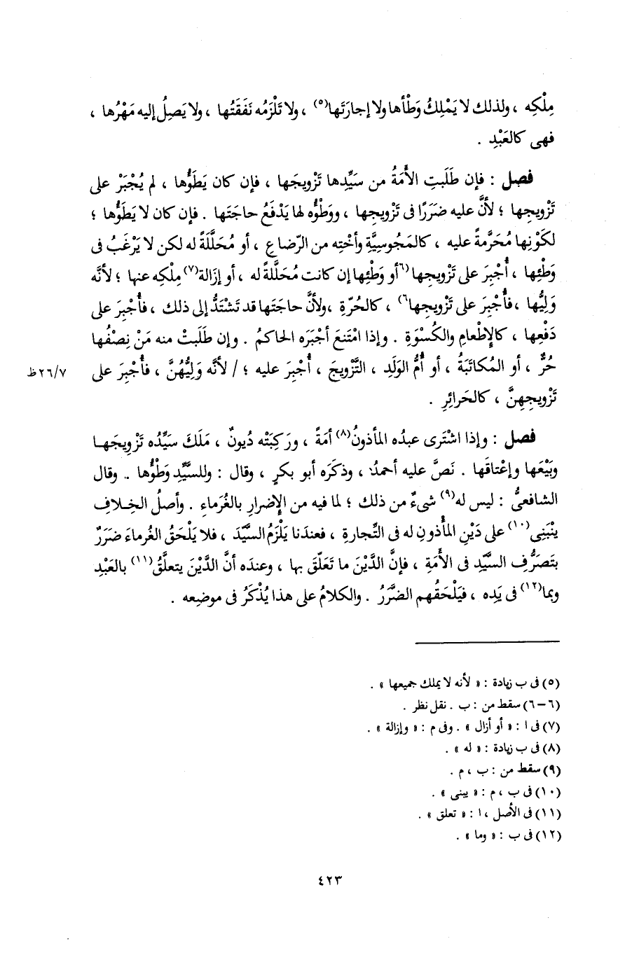 فصل: فإن طَلَبتِ الأَمَةُ من سَيِّدها تَزْويجَها، فإن كان يَطَؤُها، لم يُجْبَرْ على تَزْويجِها؛ لأنَّ عليه ضَرَرًا فى تَزْويجِها، ووَطْؤُه لها يَدْفَعُ حاجَتَها. فإن كان لا يَطَؤُها؛ لكَوْنِها مُحَرَّمةً عليه، كالمَجُوسِيَّةِ وأخْتِه من الرَّضاعِ، أو مُحَلَّلَةً له لكن لا يَرْغَبُ فى وَطْئِها، أُجْبِرَ على تَزْويجِها [أو وَطْئِها إن كانت مُحَلَّلةً له، أو إزَالة (٦) مِلْكِه عنها؛ لأنَّه وَلِيُّها، فأُجْبِرَ على تَزْويجِها] (٧)، كالحُرَّةِ، ولأنَّ حاجَتَها قد تَشْتَدُّ إلى ذلك، فأُجْبِرَ على دَفْعِها، كالإِطْعامِ والكُسْوَةِ. وإذا امْتَنعَ أجْبَرَه الحاكمُ. وإن طَلَبتْ منه مَنْ نِصْفُها حُرٌّ، أو المُكاتَبَةُ، أو أُمُّ الوَلَدِ، التَّزْويجَ، أُجْبِرَ عليه؛ لأَنَّه وَلِيُّهُنَّ، فأُجْبِرَ على تَزْويجِهِنَّ، كالحَرائِرِ.