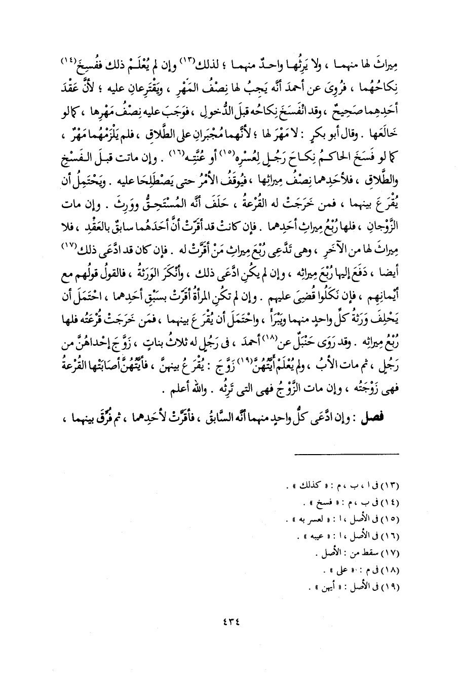 مِيراثَ لها منهما، ولا يَرِثُها واحدٌ منهما؛ لذلك (١٣) وإن لم يُعْلَمْ ذلك ففُسِخَ (١٤) نِكاحُهُما، فرُوِىَ عن أحمدَ أنَّه يَجِبُ لها نِصْفُ المهْرِ، ويَقْتَرِعانِ عليه؛ لأنَّ عَقْدَ أحَدِهِما صَحِيحٌ، وقد انْفَسَخَ نِكاحُه قبلَ الدُّخولِ، فوَجَبَ عليه نِصْفُ مَهْرِها، كما لو خَالَعَها. وقال أبو بكرٍ: لا مَهْرَ لها؛ لأنهما مُجْبَرانِ على الطَّلاقِ، فلم يَلْزَمْهُما مَهْرٌ، كما لو فَسَخَ الحاكمُ نِكاحَ رَجُلٍ لِعُسْرِه (١٥) أو عُنَّتِه (١٦). وإن ماتت قبلَ الفَسْخِ والطَّلاقِ، فلأحَدِهما نِصْفُ مِيراثِها، فيُوقَفُ الأمْرُ حتى يَصْطَلِحَا عليه. ويَحْتَمِلُ أن يُقْرَعَ بينهما، فمن خَرَجَتْ له القُرْعةُ، حَلَفَ أنَّه المُسْتَحِقُّ ووَرِثَ. وإن مات الزَّوْجانِ، فلها رُبْعُ مِيراثِ أحَدِهما. فإن كانتْ قد أقَرَّتْ أَنَّ أحَدَهُما سابقٌ بالعَقْدِ، فلا مِيراثَ لها من الآخَرِ، وهى تَدَّعِى رُبْعَ مِيراثِ مَنْ أقَرَّتْ له. فإن كان قد ادَّعَى ذلك (١٧) أيضًا، دَفَعَ إليها رُبْعَ مِيراثِه، وإن لم يكُنِ ادَّعَى ذلك، وأَنْكَرَ الوَرَثةُ، فالقولُ قولُهم مع أيْمانِهِم، فإن نَكَلُوا قُضِىَ عليهم. وإن لم تكُنِ المرأةُ أقَرَّتْ بسَبْقِ أحَدِهما، احْتَمَلَ أن يَحْلِفَ وَرَثةُ كلِّ واحدٍ منهما ويَبْرأ، واحْتَمَلَ أن يُقْرَعَ بينهما، فمَن خَرَجَتْ قُرْعَتُه فلها رُبْعُ مِيراثِه. وقد رَوَى حَنْبَلٌ عن (١٨) أحمدَ، فى رَجُلٍ له ثلاثُ بناتٍ، زَوَّجَ إحْداهُنَّ من رَجُلٍ، ثم مات الأبُ، ولم يُعْلَمْ أيَّتُهُنَّ (١٩) زَوَّجَ: يُقرَعُ بينهنَّ، فأيَّتُهُنَّ أصَابَتْها القُرْعةُ فهى زَوْجَتُه، وإن مات الزَّوْجُ فهى التى تَرِثُه. واللَّه أعلم.