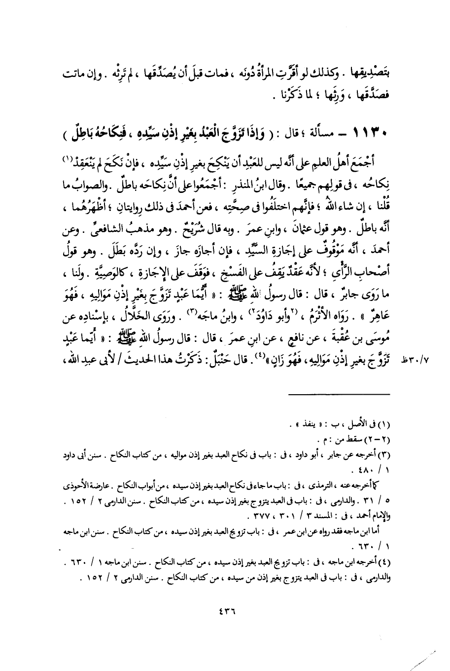 ١١٣٠ - مسأَلة؛ قال: (وَإِذَا تَزَوَّجَ الْعَبْدُ بِغيْرِ إِذْنِ سَيِّدهِ، فَنِكَاحُهُ بَاطِلٌ)