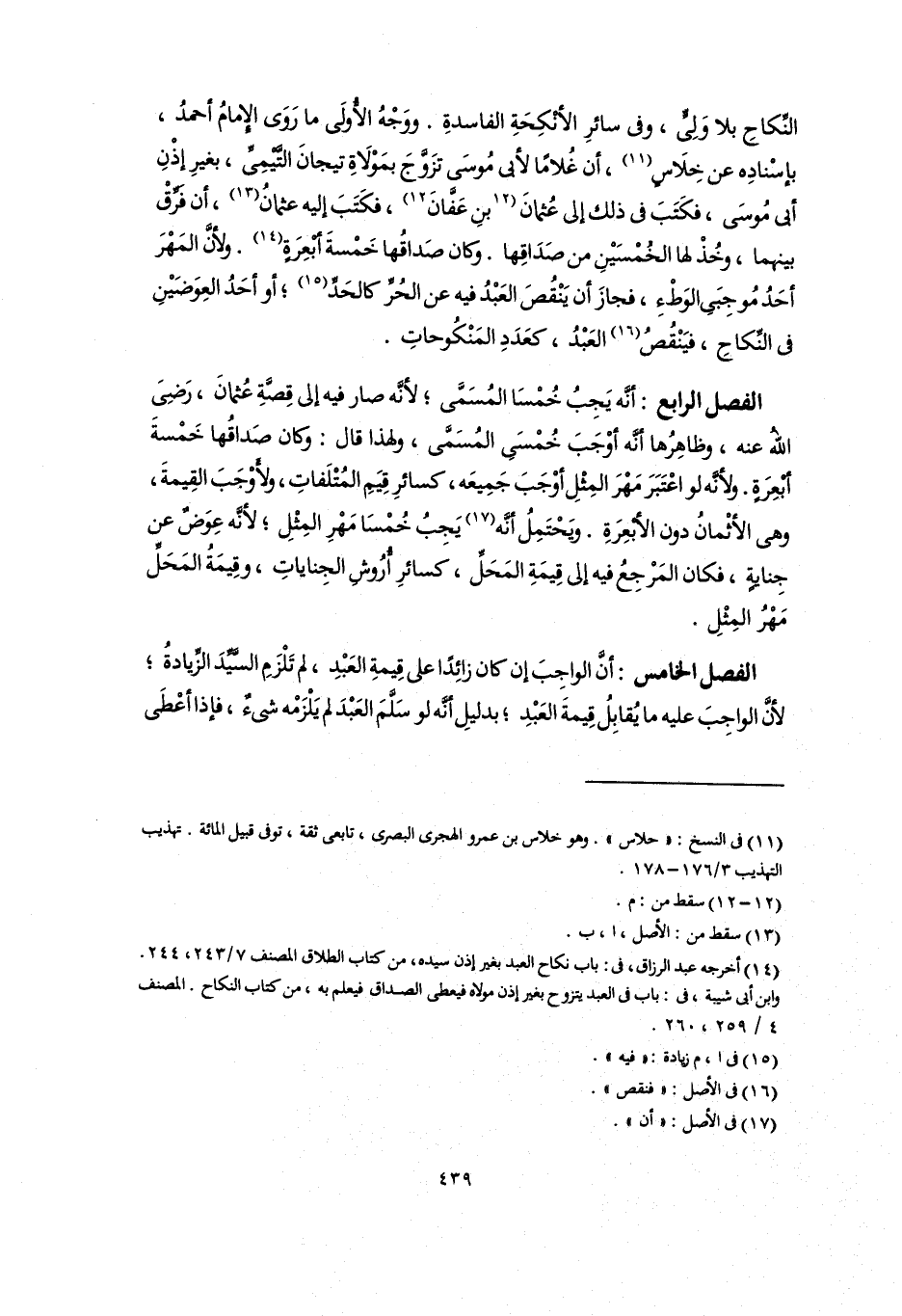 النِّكاحِ بلا وَلِىٍّ، وفى سائرِ الأنْكِحَةِ الفاسدةِ. ووَجْهُ الأُولَى ما رَوَى الإِمامُ أحمدُ، بإسْنادِه عن خِلَاسٍ (١١)، أن غُلامًا لأبى مُوسَى تزَوَّجَ بمَوْلَاةِ تيجانَ التَّيْمِىِّ، بغيرِ إذْنِ أبى مُوسَى، فكَتَبَ فى ذلك إلى عُثمانَ [بنِ عَفَّانَ] (١٢)، فكَتَبَ إليه عثمانُ (١٣)، أن فَرِّقْ بينهما، وخُذْ لها الخُمْسَيْنِ من صَدَاقِها. وكان صَداقُها خَمْسةَ أبْعِرَةٍ (١٤). ولأنَّ المَهْرَ أحَدُ مُوجِبَى الوَطْءِ، فجازَ أن يَنْقُصَ العَبْدُ فيه عن الحُرِّ كالحَدِّ (١٥)؛ أو أحَدُ العِوَضَيْنِ فى النِّكاحِ، فيَنْقُصُ (١٦) العَبْدُ، كعَدَدِ المَنْكُوحاتِ.