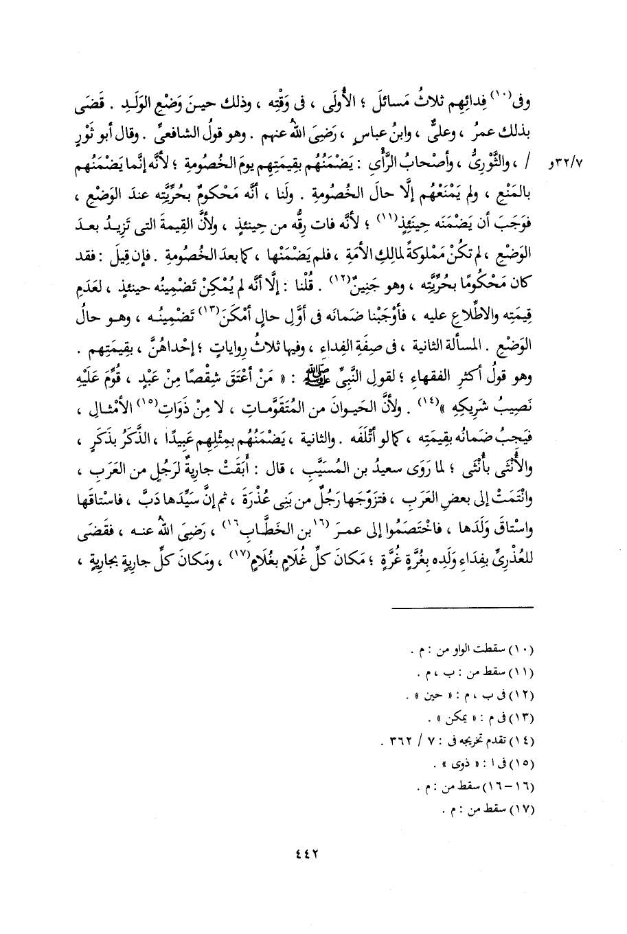 وفى (١٠) فِدائِهِم ثلاثُ مَسائلَ؛ الأولَى، فى وَقْتِه، وذلك حينَ وَضْعِ الوَلَدِ. قَضَى بذلك عمرُ، وعلىٌّ، وابنُ عباسٍ، رضى اللَّه عنهم. وهو قولُ الشافعىِّ. وقال أبو ثَوْرٍ، والثَّوْرِىُّ، وأصْحابُ الرَّأْىِ: يَضْمَنُهُم بقِيمَتِهِم يومَ الخُصُومةِ؛ لأنَّه إنَّما يَضْمَنُهم بالمَنْعِ، ولم يَمْنَعْهُم إلَّا حالَ الخُصُومةِ. ولَنا، أنَّه مَحْكومٌ بحُرِّيَّتِه عندَ الوَضْعِ، فوَجَبَ أن يَضْمَنَه حِينَئِذٍ (١١)؛ لأنَّه فات رِقُّه من حِينئذٍ، ولأنَّ القِيمةَ التى تَزِيدُ بعدَ الوَضْعِ، لم تكُنْ مَمْلوكةً لمالِكِ الأَمَةِ، فلم يَضْمَنْها، كما بعدَ الخُصُومةِ. فإن قِيلَ: فقد كان مَحْكُومًا بحُرِّيَّتِه، وهو جَنِينٌ (١٢). قُلْنا: إلَّا أنَّه لم يُمْكِنْ تَضْمِينُه حينئذٍ، لعَدَمِ قِيمَتِه والاطِّلاعِ عليه، فأوْجَبْنا ضَمانَه فى أوَّلِ حالٍ أمْكَنَ (١٣) تَضْمِينُه، وهو حالُ الوَضْعِ. المسألة الثانية، فى صِفَةِ الفِداء، وفيها ثلاث رِواياتٍ؛ إحْداهُنَّ، بقِيمَتِهم. وهو قولُ أكثرِ الفقهاءِ؛ لقولِ النَّبِىِّ -صلى اللَّه عليه وسلم-: "مَنْ أعْتَقَ شِقْصًا مِنْ عَبْدٍ، قُوِّمَ عَلَيْهِ نَصِيبُ شَرِيكِهِ" (١٤). ولأنَّ الحَيوانَ من المُتَقَوَّماتِ، لا مِنْ ذَوَاتِ (١٥) الأمْثالِ، فيَجبُ ضَمانُه بقِيمَتِه، كما لو أتْلَفَه. والثانية، يَضْمَنُهُم بمِثْلِهِم عَبيدًا، الذَّكَرُ بذَكَرٍ، والأُنْثَى بأُنْثَى؛ لما رَوَى سعيدُ بن المُسَيَّبِ، قال: أَبَقَتْ جارِيةٌ لرَجُلٍ من العَرَبِ، وانْتَمَتْ إلى بعضِ العَرَبِ، فتزَوَّجَها رَجُلٌ من بَنِى عُذْرَةَ، ثم إنَّ سَيِّدَها دَبَّ، فاسْتاقَها واسْتاقَ وَلَدَها، فاخْتَصَمُوا إلى عمرَ [بن الخَطَّابِ] (١٦)، رضى اللَّه عنه، فقَضَى للعُذْرِىِّ بفِدَاءِ وَلَدِه بِغُرَّةٍ غُرَّةٍ؛ مَكانَ كلِّ غُلَامٍ بغُلَامٍ (١٧)، ومَكانَ كلِّ جارِيةٍ بجارِيةٍ،