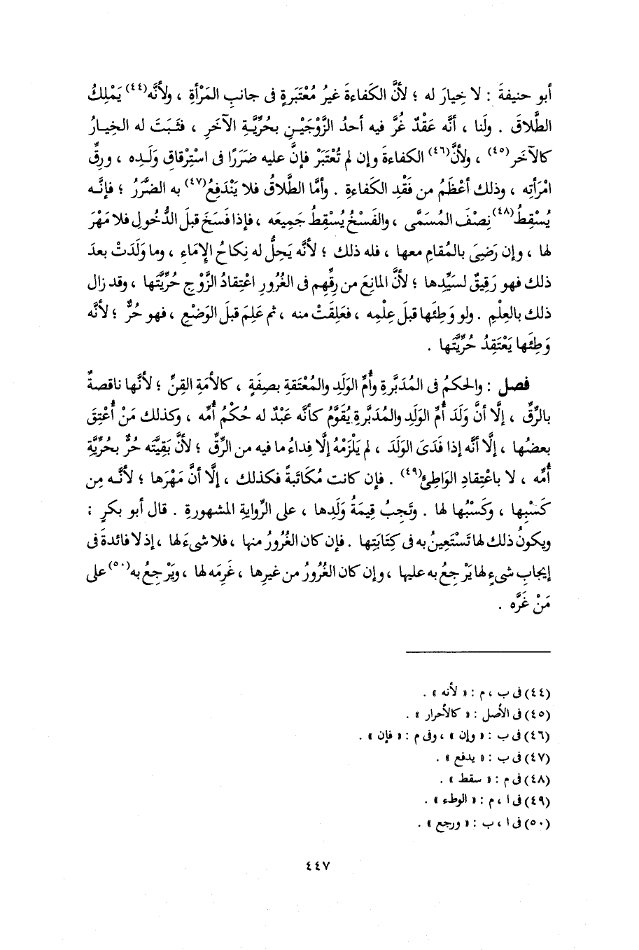 فصل: والحكمُ فى المُدَبَّرةِ وأُمِّ الوَلَدِ والمُعْتَقةِ بصِفَةٍ، كالأمَةِ القِنِّ؛ لأنَّها ناقصةٌ بالرِّقِّ، إلَّا أَنَّ وَلَدَ أُمِّ الوَلَدِ والمُدَبَّرةِ يُقَوَّمُ كأنَّه عَبْدٌ له حُكْمُ أُمِّه، وكذلك مَنْ أُعْتِقَ بعضُها، إلَّا أنَّه إذا فَدَىَ الوَلَدَ، لم يَلْزَمْهُ إلَّا فِداءُ ما فيه من الرِّقِّ؛ لأنَّ بَقِيَّتَه حُرٌّ بحُرِّيَّةِ أُمِّه، لا باعْتِقادِ الوَاطِئ (٤٩). فإن كانت مُكَاتَبةً فكذلك، إلَّا أنَّ مَهْرَها؛ لأنَّه مِن كَسْبِها، كسْبُها لها. وتَجِبُ قِيمَةُ وَلَدِها، على الرِّوايةِ المشهورةِ. قال أبو بكرٍ: ويكونُ ذلك لها تَسْتَعِينُ به فى كِتَابَتِها. فإن كان الغُرُورُ منها، فلا شىءَ لها، إذ لا فائدةَ فى إيجابِ شىءٍ لها يَرْجِعُ به عليها، وإن كان الغُرُورُ من غيرِها، غَرِمَه لها، ويَرْجِعُ به (٥٠) على مَنْ غَرَّه.