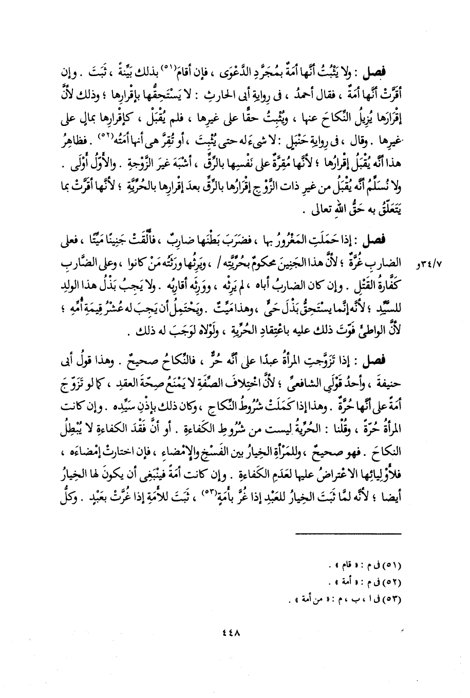 فصل: ولا يَثْبُتُ أنَّها أمَةٌ بمُجَرَّدِ الدَّعْوَى، فإن أقامَ (٥١) بذلك بَيِّنةً، ثَبَتَ. وإن أقَرَّتْ أنَّها أمَةٌ، فقال أحمدُ، فى رِوايةِ إلى الحارثِ: لا يَسْتَحِقُّها بإقْرارِها؛ وذلك لأنَّ إقْرَارَها يُزِيلُ النِّكاحَ عنها، ويُثْبِتُ حقًّا على غيرِها، فلم يُقْبَلْ، كإقْرارِها بمالٍ على غيرِها. وقال، فى رِوايةِ حَنْبَلٍ: لا شىءَ له حتى يُثْبِتَ، أو تُقِرَّ هى أنها أمَتُه (٥٢). فظاهِرُ هذا أنَّه يُقْبَلُ إقْرارُها؛ لأنَّها مُقِرَّةٌ على نَفْسِها بالرِّقِّ، أشْبَهَ غيرَ الزَّوْجةِ. والأَوّلُ أَوْلَى. ولا نُسَلِّمُ أنَّه يُقْبَلُ من غيرِ ذات الزَّوْجِ إقْرَارُها بالرِّقِّ بعدَ إقْرارِها بالحُرِّيَّةِ؛ لأنَّها أقَرَّتْ بما يَتَعَلَّقُ به حَقُّ اللَّهِ تعالى.