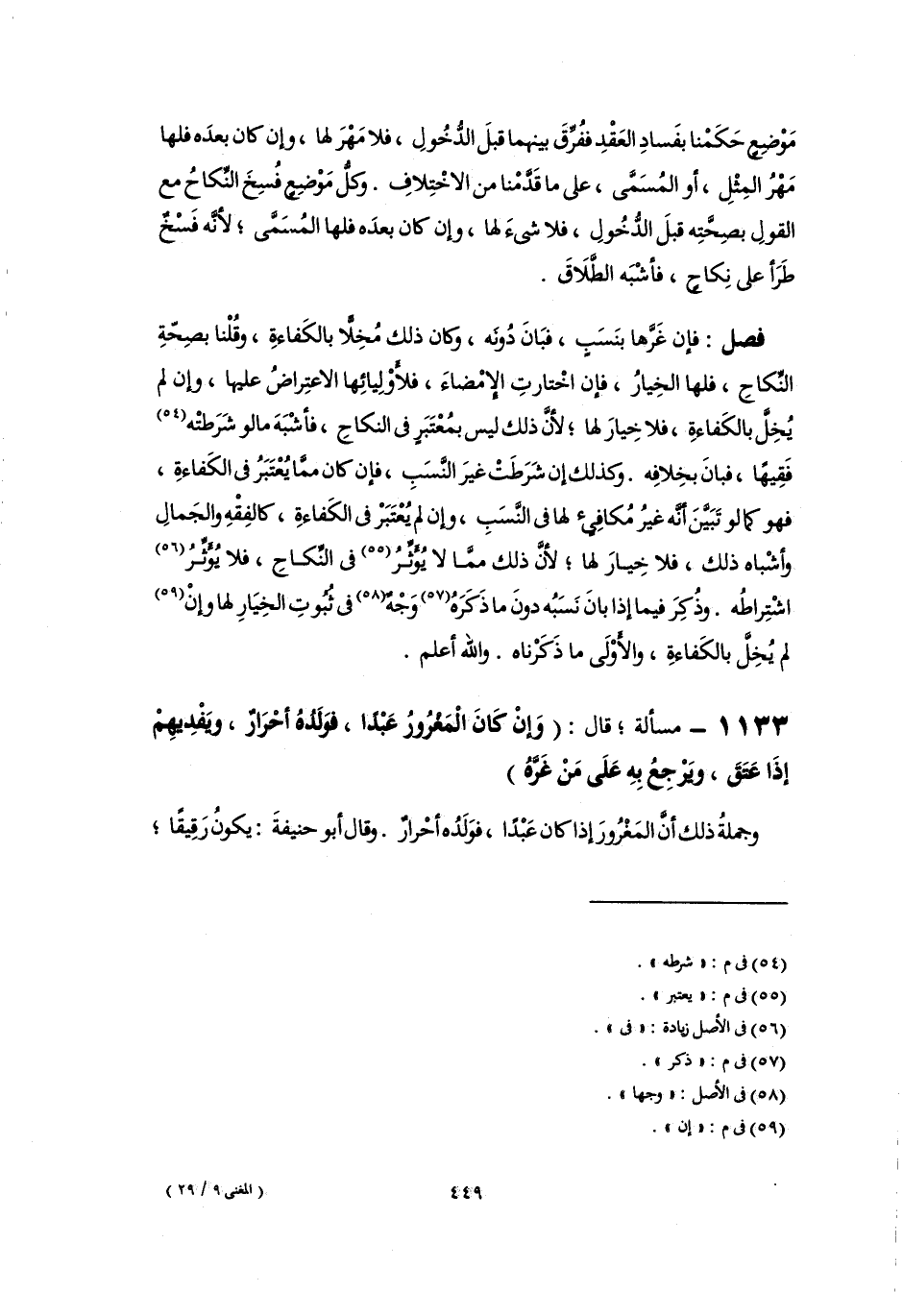 فصل: فإن غَرَّهابنَسَبٍ، فبَانَ دُونَه، وكان ذلك مُخِلًّا بالكَفاءةِ، وقُلْنا بصِحّةِ النِّكاحِ، فلها الخِيارُ، فإن اخْتارتِ الإِمْضاءَ، فلأَوْلِيائِها الاعتِراضُ عليها، وإن لم يُخِلَّ بالكَفاءةِ، فلا خِيارَ لها؛ لأنَّ ذلك ليس بمُعْتَبَرٍ فى النِّكاحِ، فأشْبَهَ ما لو شَرَطتْه (٥٤) فَقِيهًا، فبانَ بخِلافِه. وكذلك إن شَرَطَتْ غيرَ النَّسَبِ، فإن كان ممَّا يُعْتَبَرُ فى الكَفاءةِ، فهو كما لو تَبَيَّنَ أنَّه غيرُ مُكافِئ لها فى النَّسَبِ، وإن لم يُعْتَبَرْ فى الكَفاءةِ، كالفِقْهِ والجَمالِ وأشْباه ذلك، فلا خِيارَ لها؛ لأنَّ ذلك ممَّا لا يُؤَثِّرُ (٥٥) فى النِّكاحِ، فلا يُؤَثِّرُ (٥٦) اشْتِراطُه. وذُكِرَ فيما إذا بانَ نَسَبُه دونَ ما ذَكَرَهُ (٥٧) وَجْهٌ (٥٨) فى ثُبُوتِ الخِيَارِ لها وإِنْ (٥٩) لم يُخِلَّ بالكَفاءةِ، والأَوْلَى ما ذَكَرْناه. واللَّه أعلم.